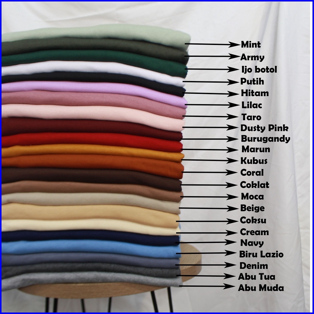 Hitam, Putih, ABU MUDA, Abu Tua, DENIM, NAVY, BIRU LAZIO, DUSTYPINK, TARO, Lilac, Cokelat, MOCCA, COKSU, Beige, CREAM, MAROON, BURUGANDY, CORAL, KUBUS, Mint, IJOBOTOL, Hijau Tua