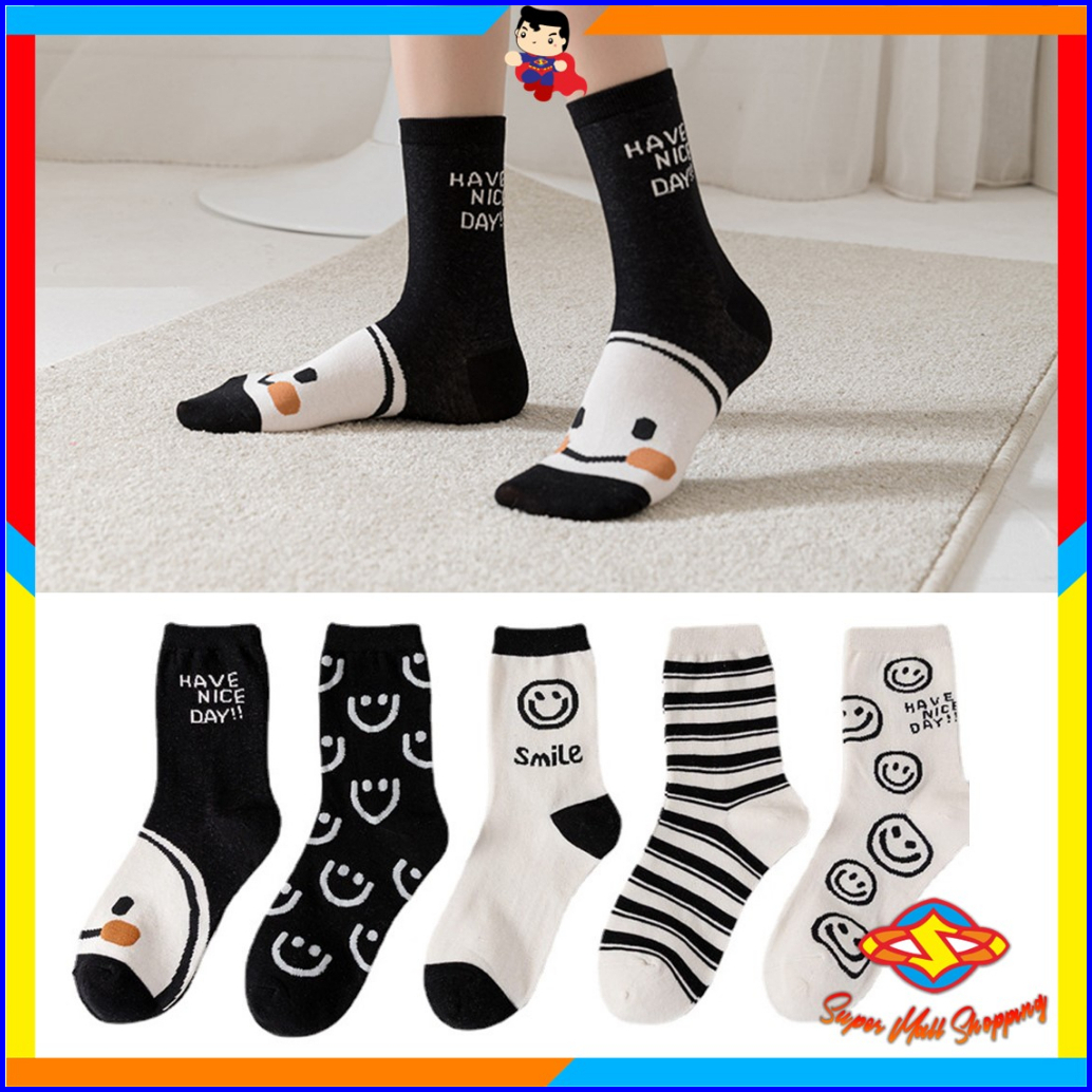 Sms Kaos Kaki Wanita Panjang 6846 Kaos Kaki Motif Smile Warna Hitam Putih Kaus Kaki Setinggi Betis Model Emoticon Senyum
