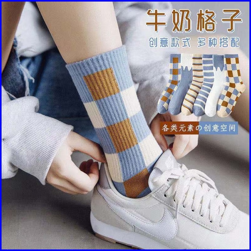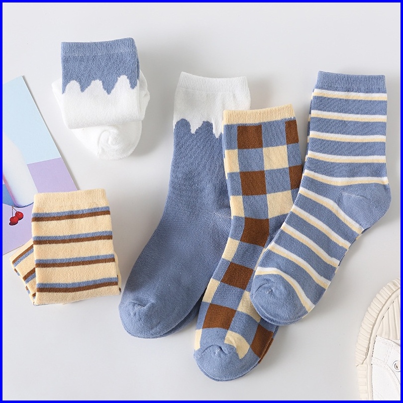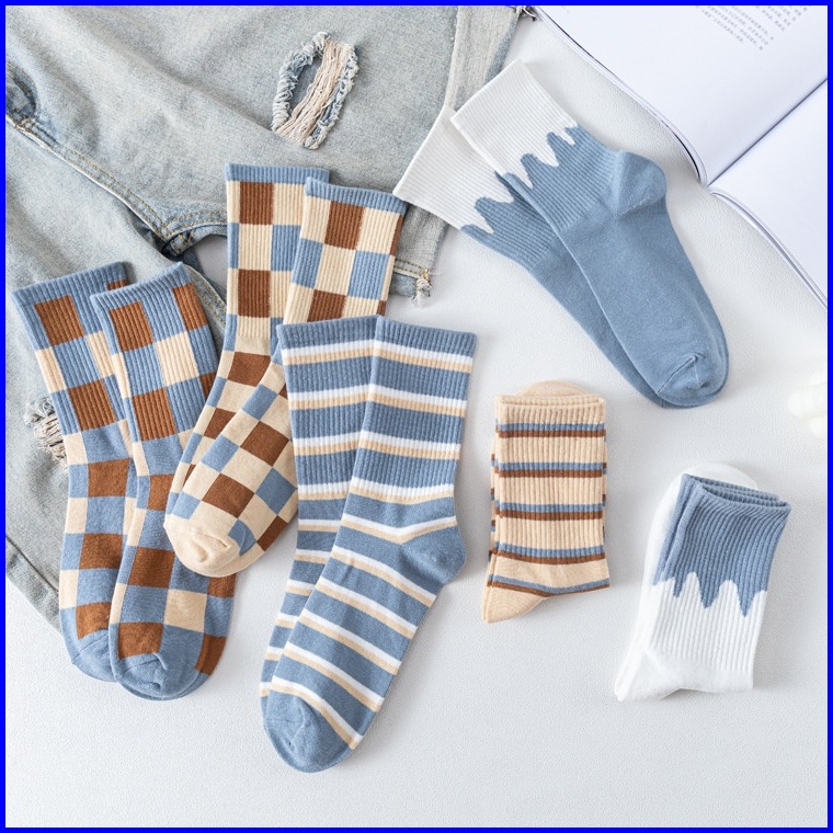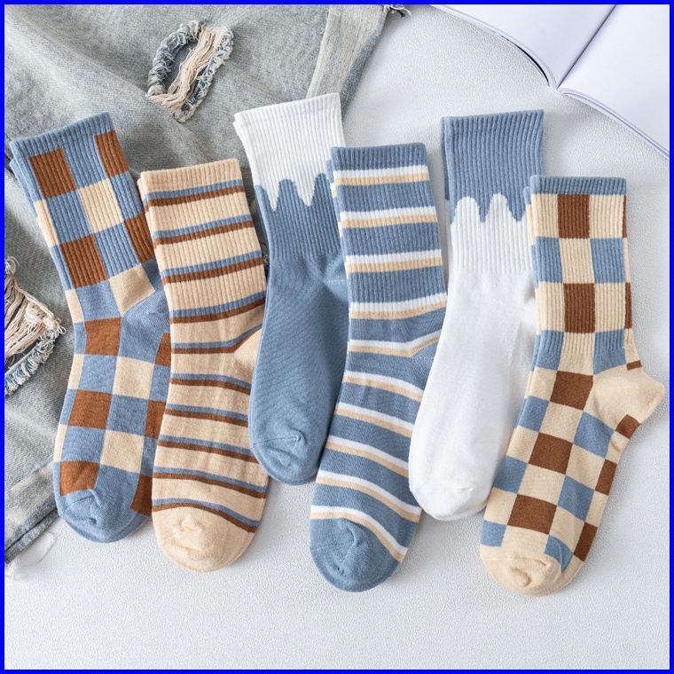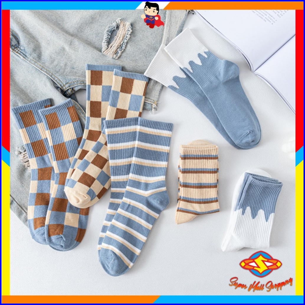 Sms Kaos Kaki Wanita Panjang Kode 6869 Kaos Kaki Motif Catur Biru Cream Kaus Kaki Setinggi Betis Corak Kotak Garis Sarun