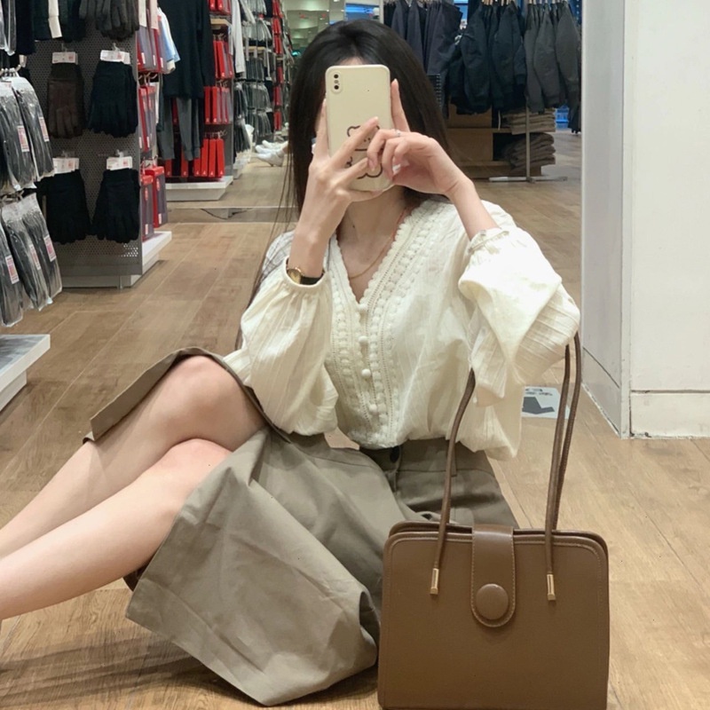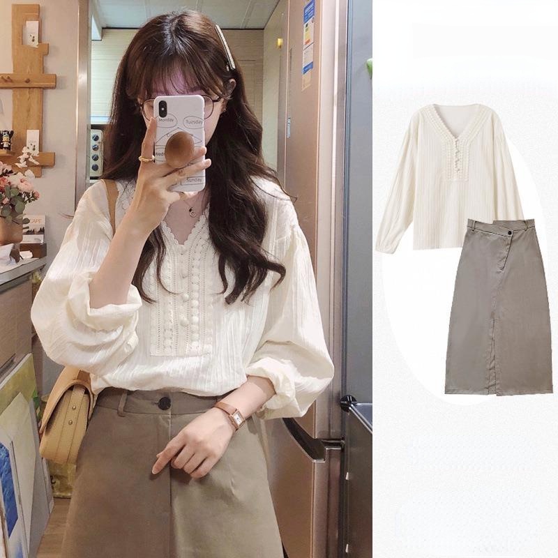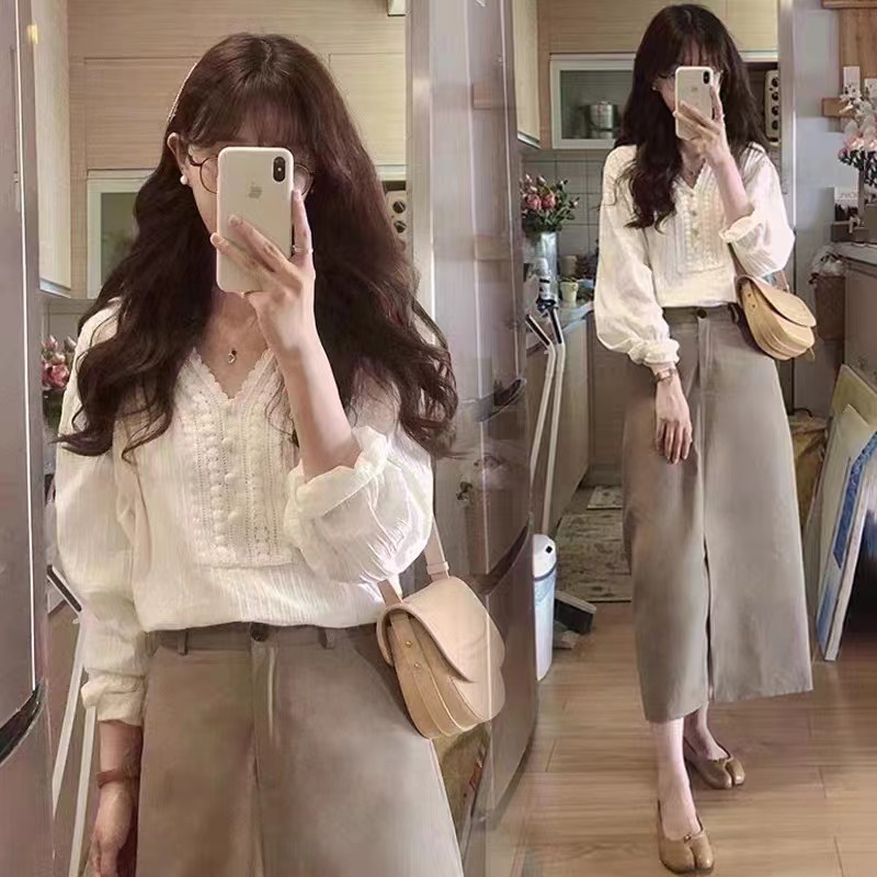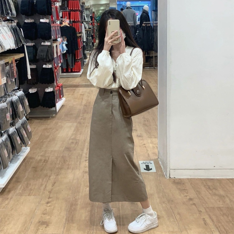 yikoo-Korea set temperamen kemeja + maxi rok baju fashion wanita