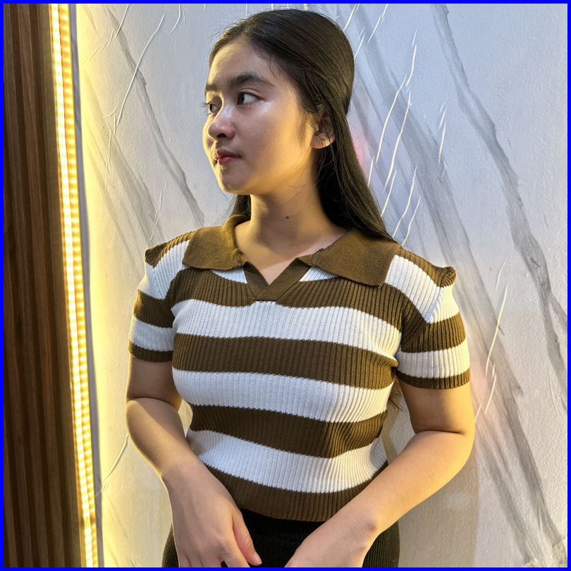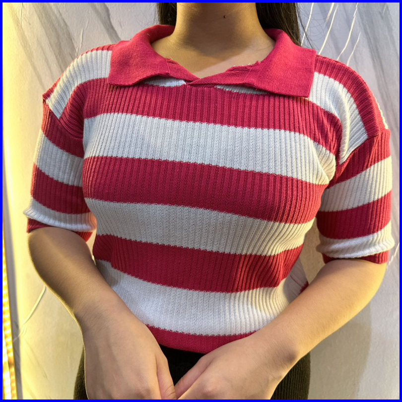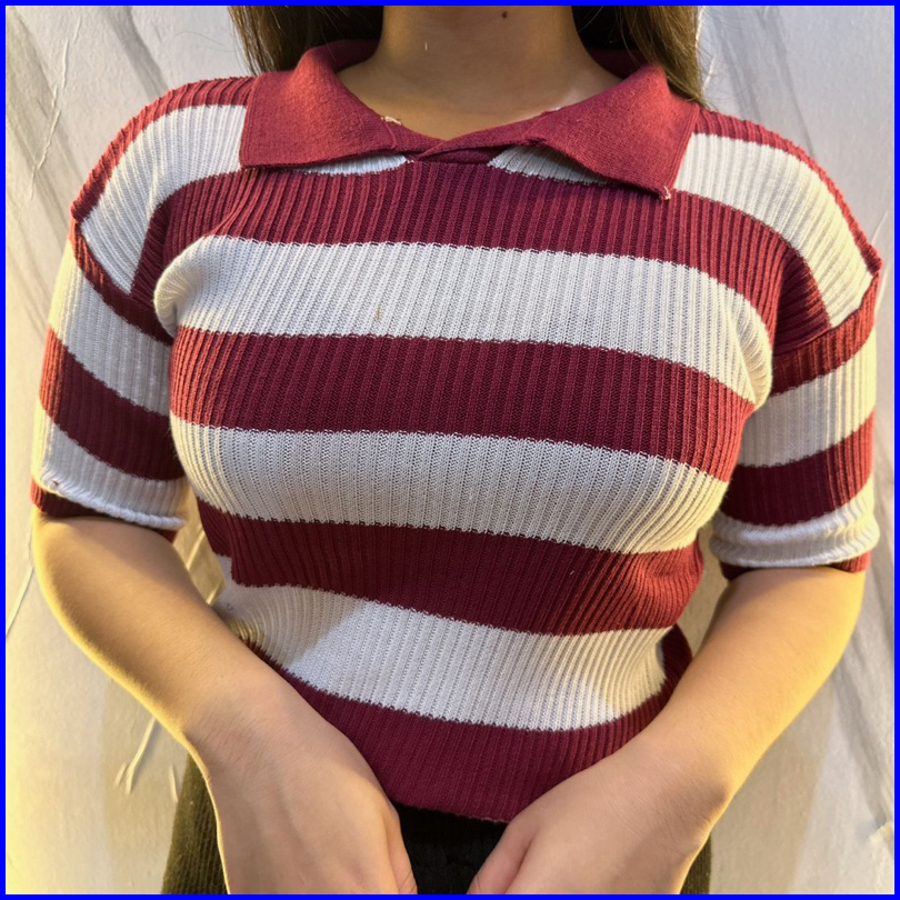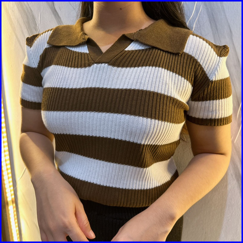 Atasan Wanita Kerah Polo Rajut Stripe - Vneck Crop Top Blouse Stripe - Polo Shirt Atasan Wanita Korean Style Tebal