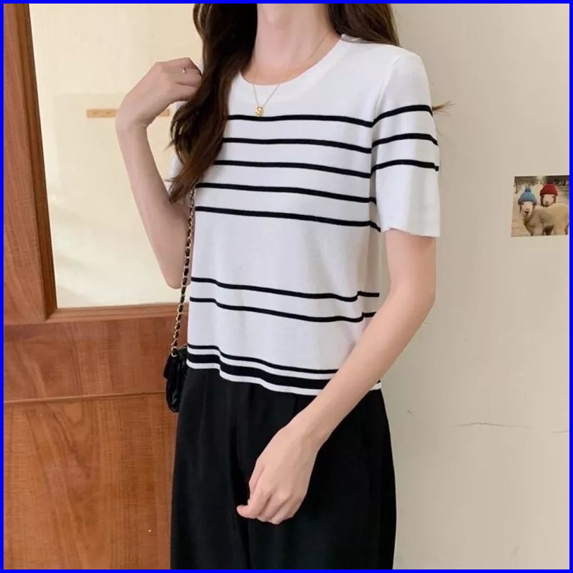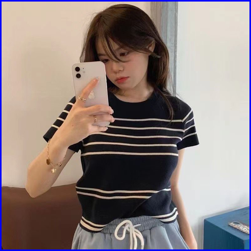 Kaos Lengan Pendek Wanita Atasan Rajut Korean Style Knit Crop Top Stripe T-shirt