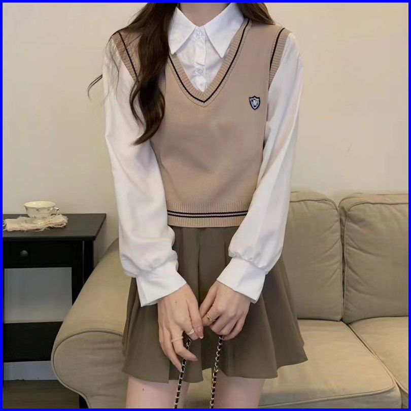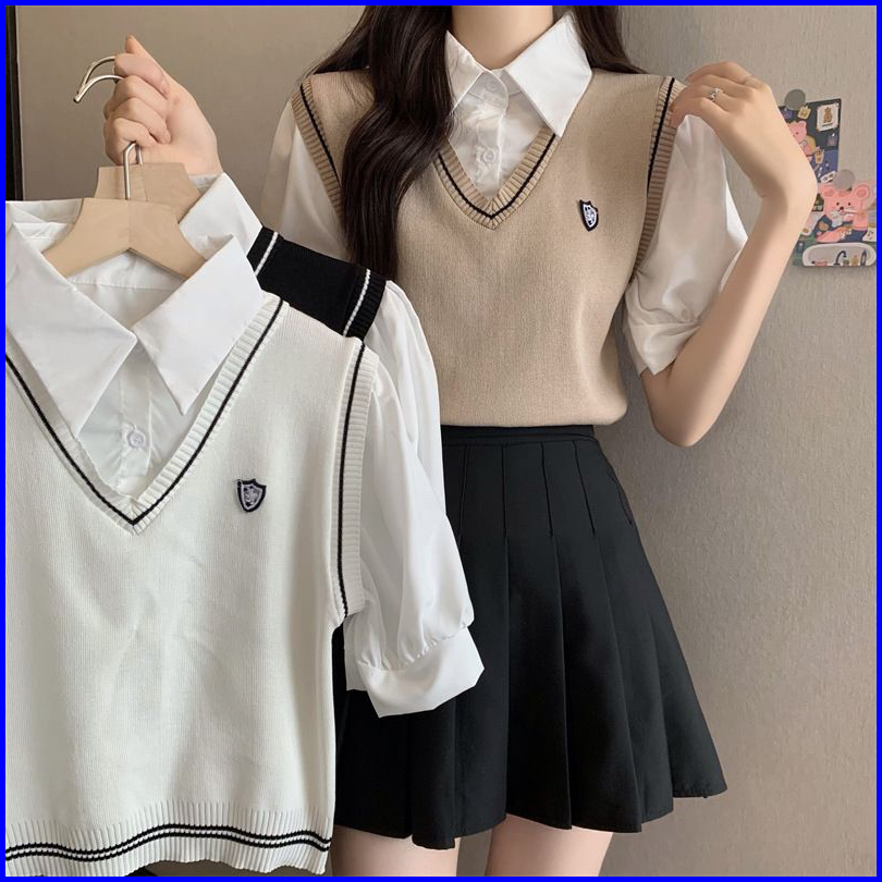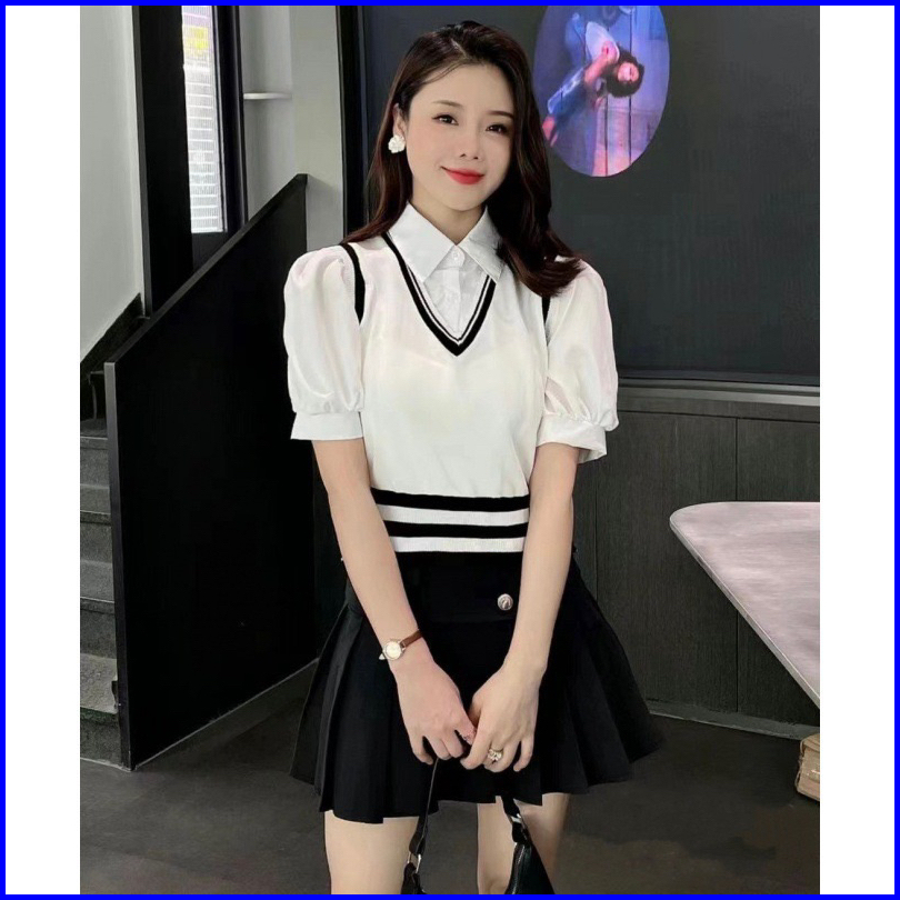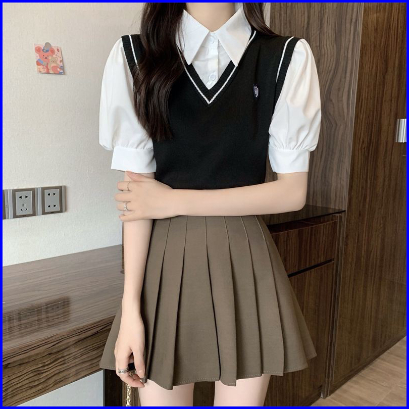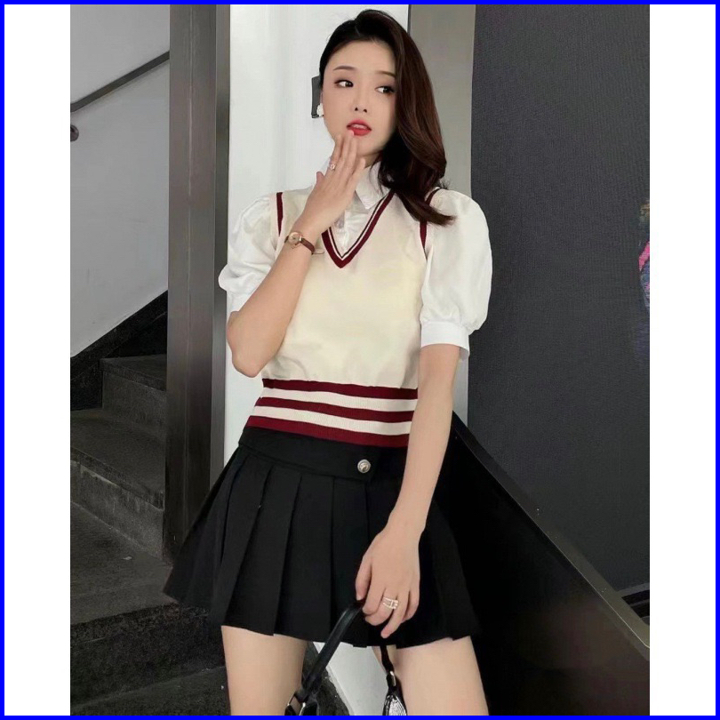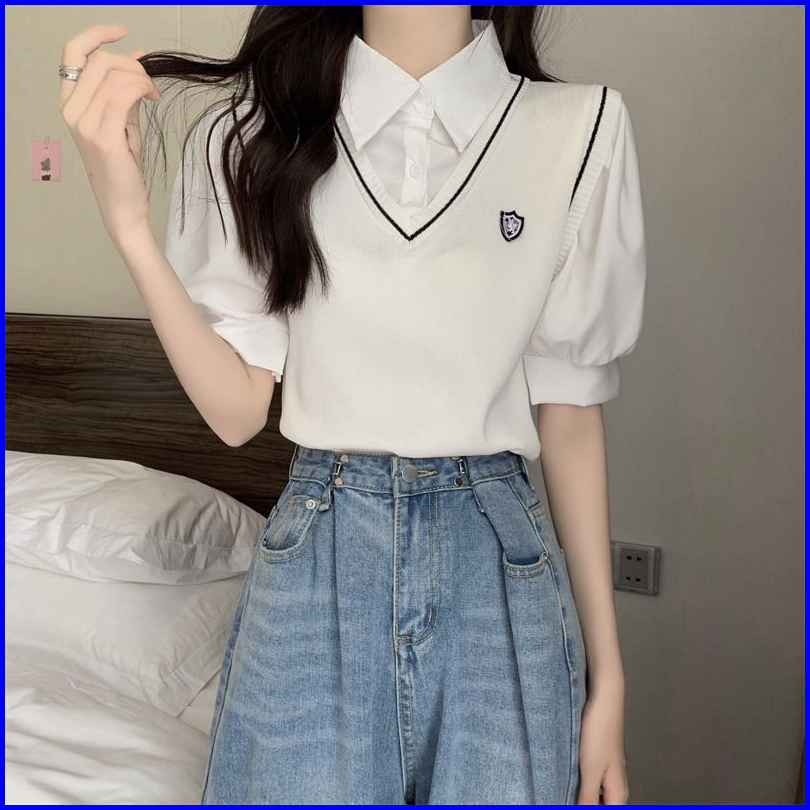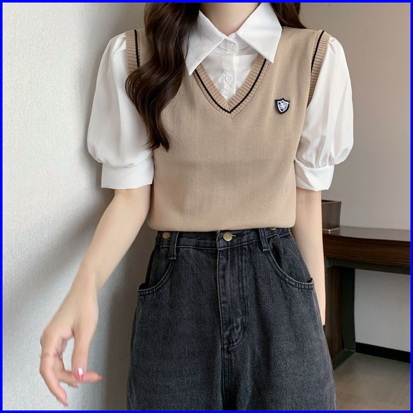 Blouse Atasan Areum Top Blouse Set Vest Shirt Polo Rompi Collar Kemeja Kerah Knit Rajut Korean Style Lengan Pendek Shirt