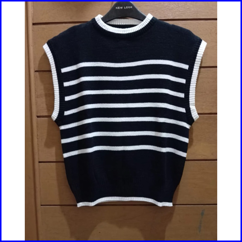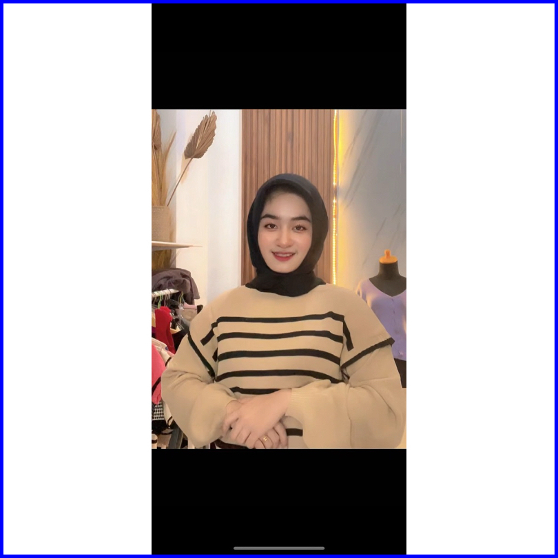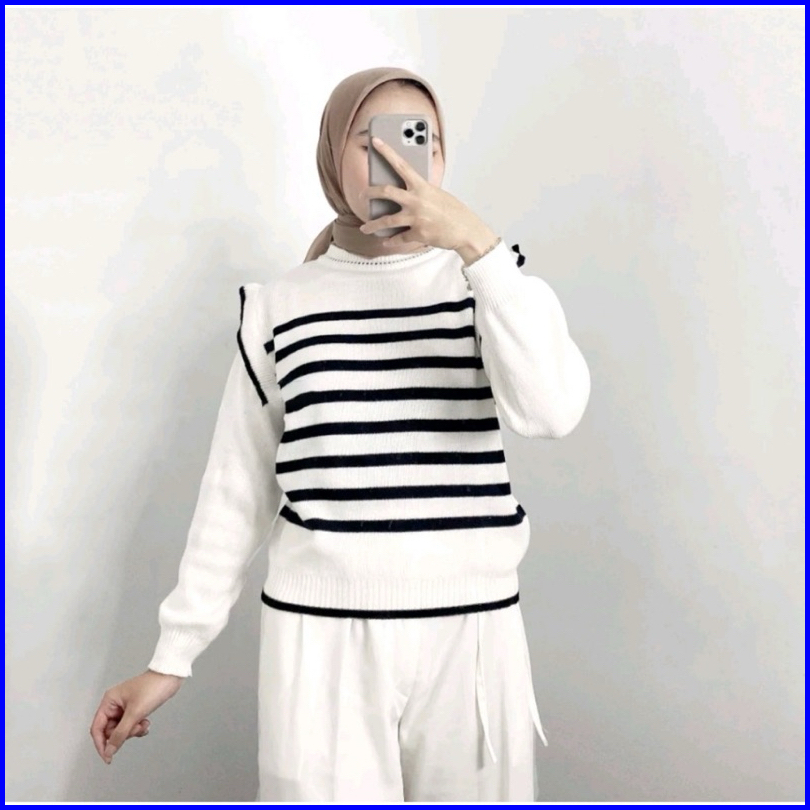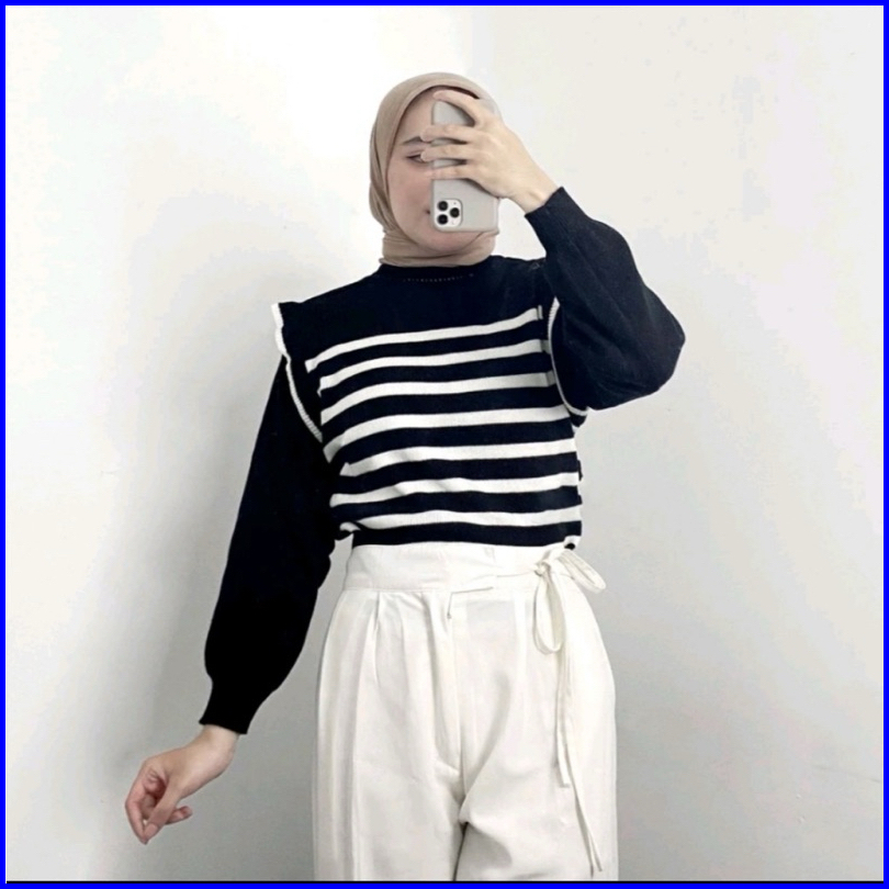Atasan Knit Wanita Lengan Balon Lengan Panjang Basic Korean Minimalis Spandeks Rajut Motif Garis