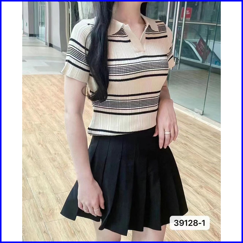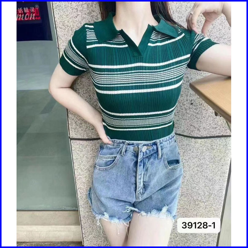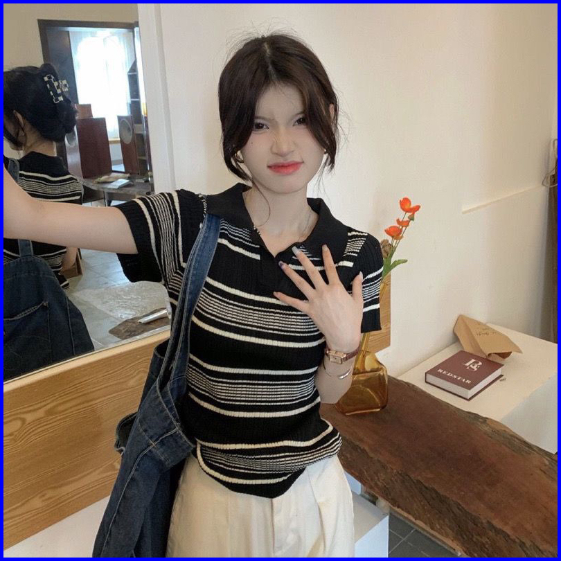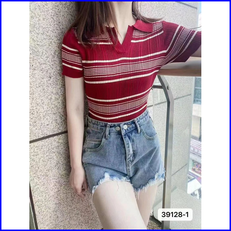 Atasan Kerah Polo Rajut Salur Kaos Salur Vneck T-shirt Atasan Wanita