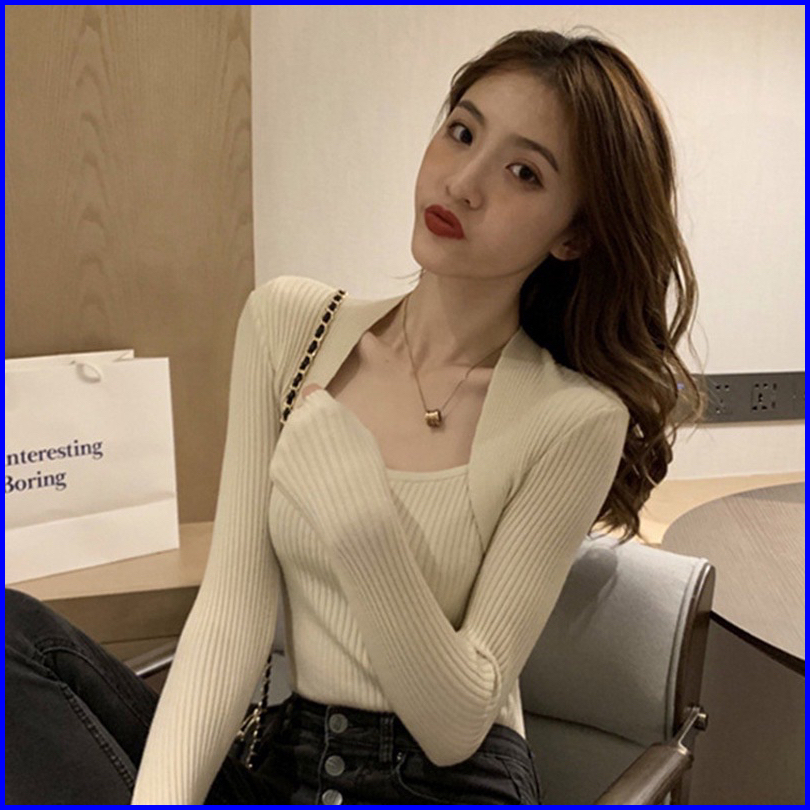 Atasan Rajut Lengan Panjang Wanita Square Neck Korea Style - Sweater Inner Rajut Lengan Panjang
