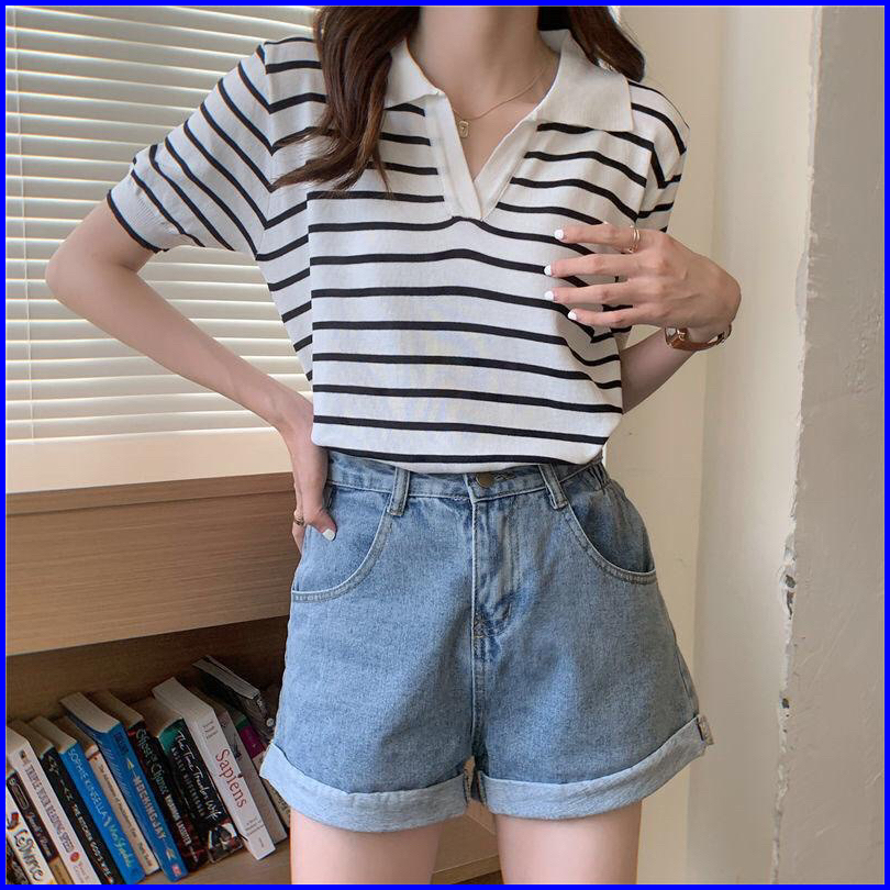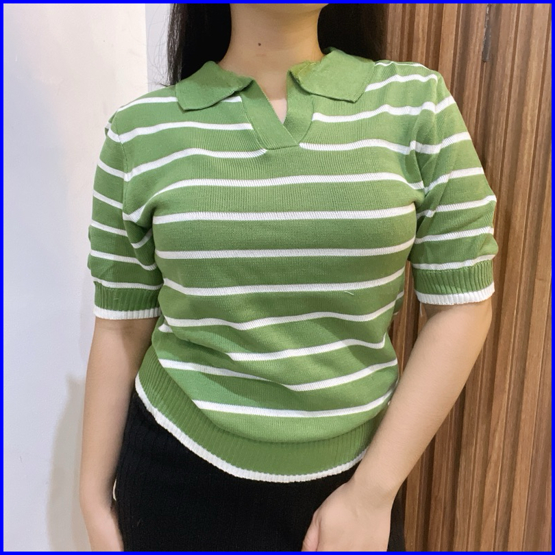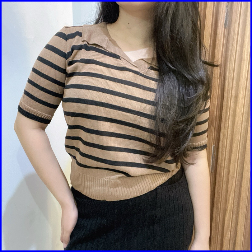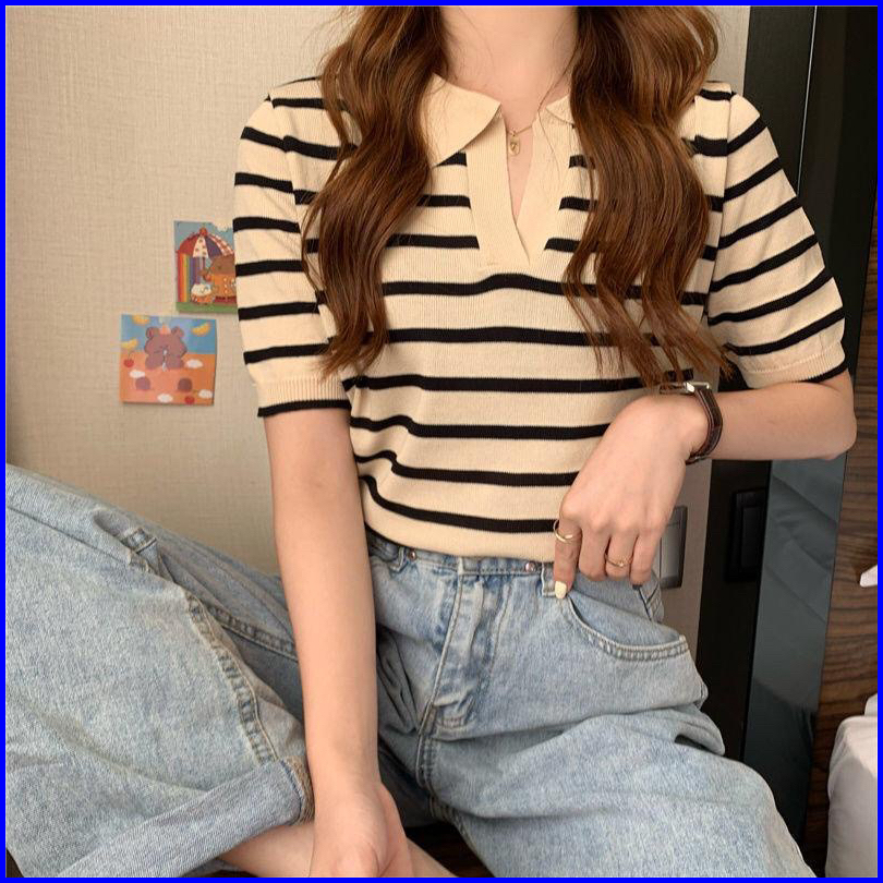 Kaos Berkerah Polo Salur - Atasan Rajut Lengan Pendek Korean Style Knit Stripe T-shirt
