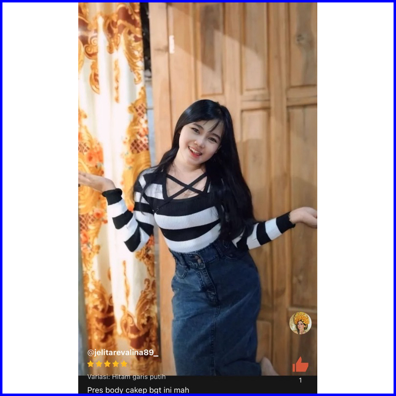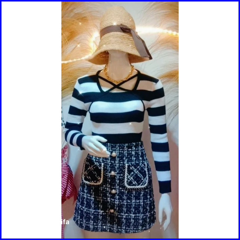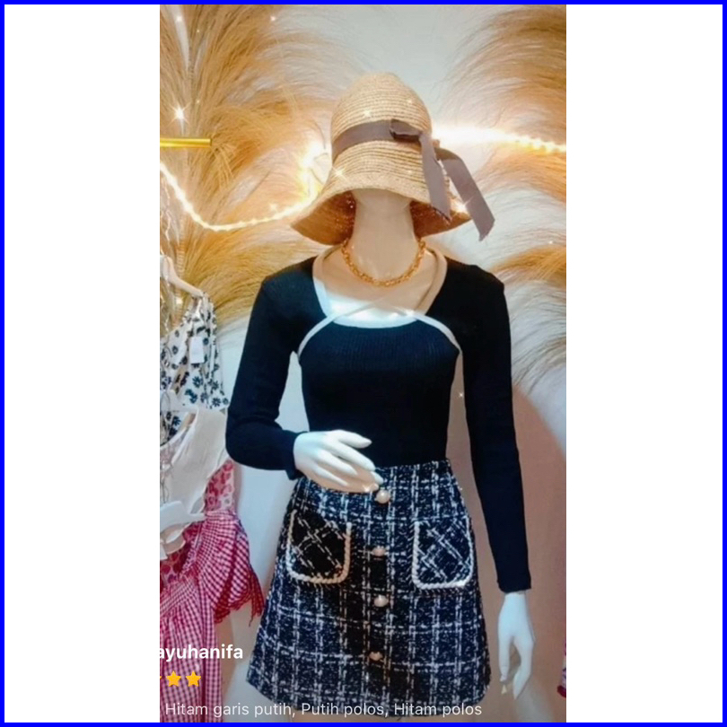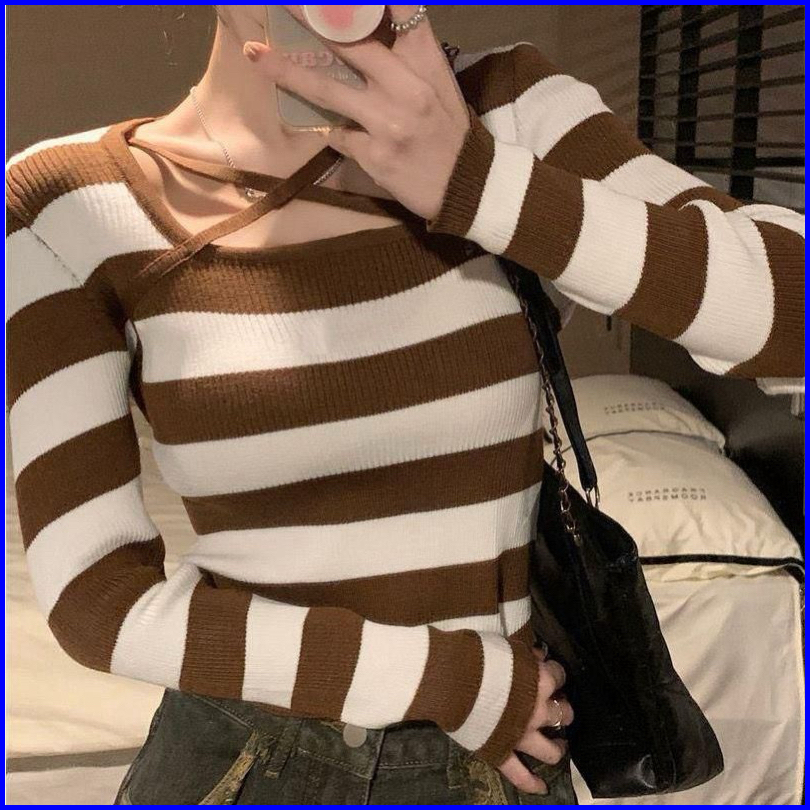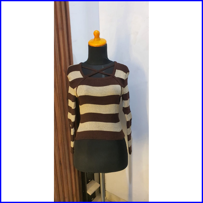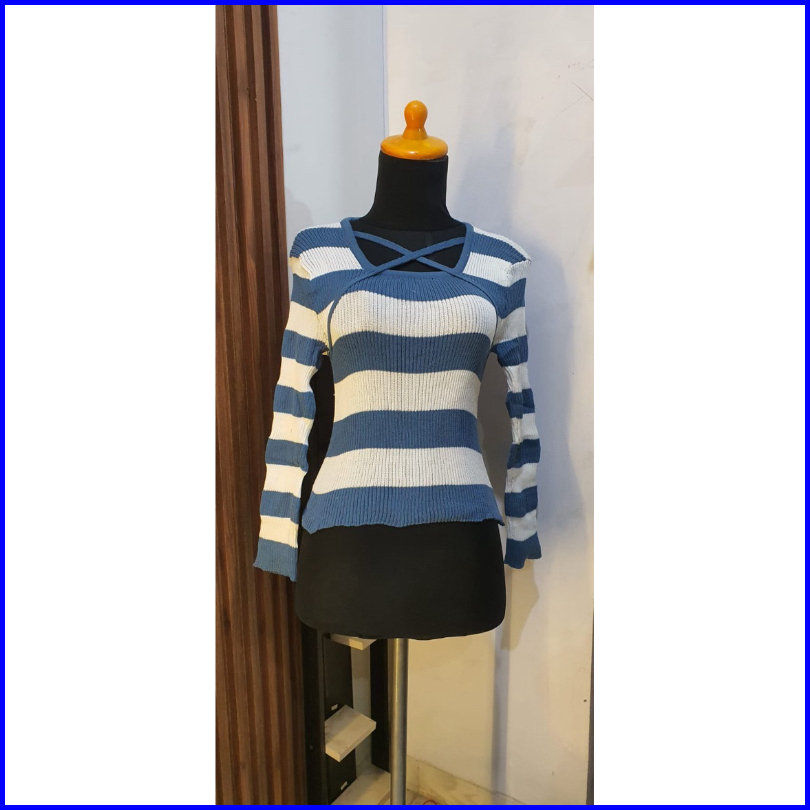 Atasan Rajut Lengan Panjang Wanita Korean Style Top Rajut Stripes Knit Square Neck Tali Silang
