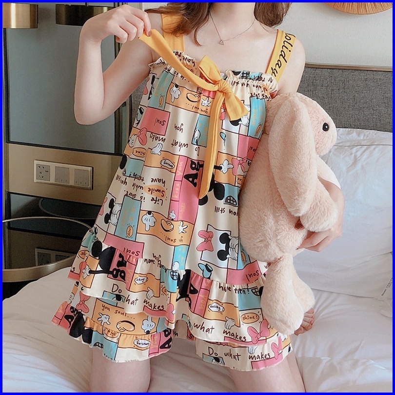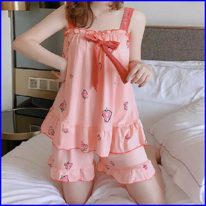 Yooyi Baju Tidur Wanita Piyama Baby Doll Setelan Perempuan Dewasa Tanpa Lengan Celana Pendek Remaja Desain Korea Motif K