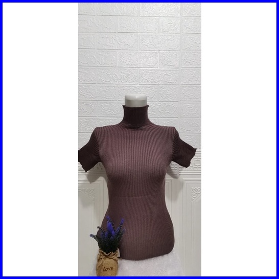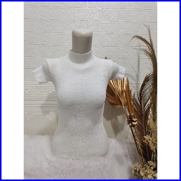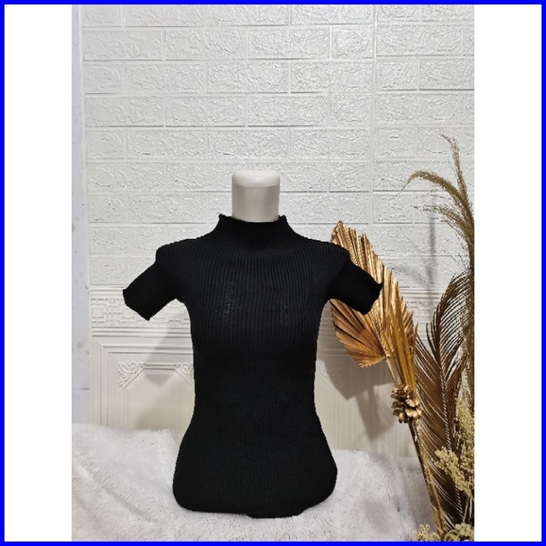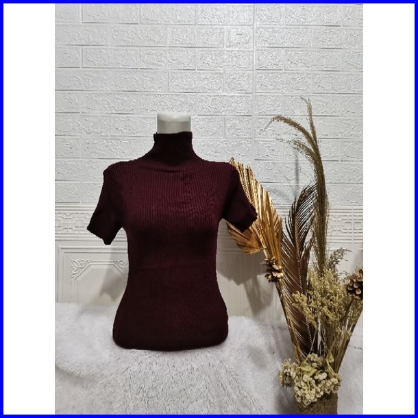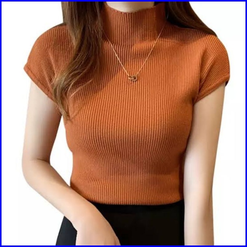 Kaos Knit Kerah Tinggi - Atasan Rajut Kerah Tinggi Lengan Pendek Tebal