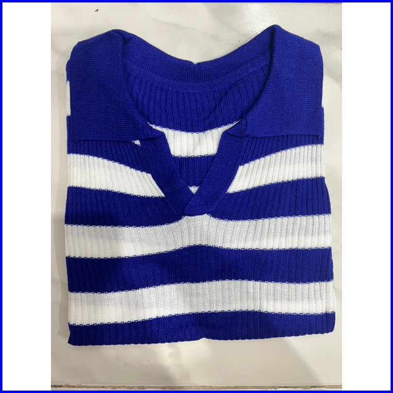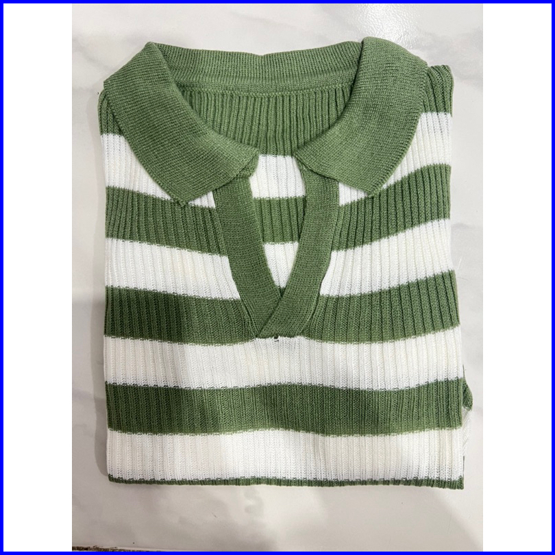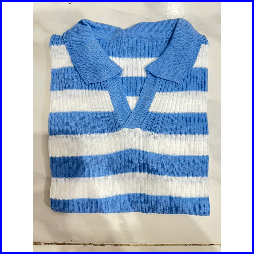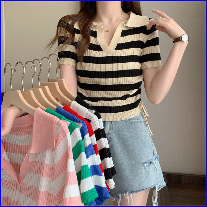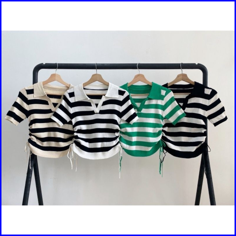 Atasan Kerah Polo Rajut Salur Tali - Vneck Crop Top Blouse Stripe - Polo Shirt Atasan Wanita Korean Style