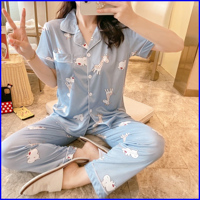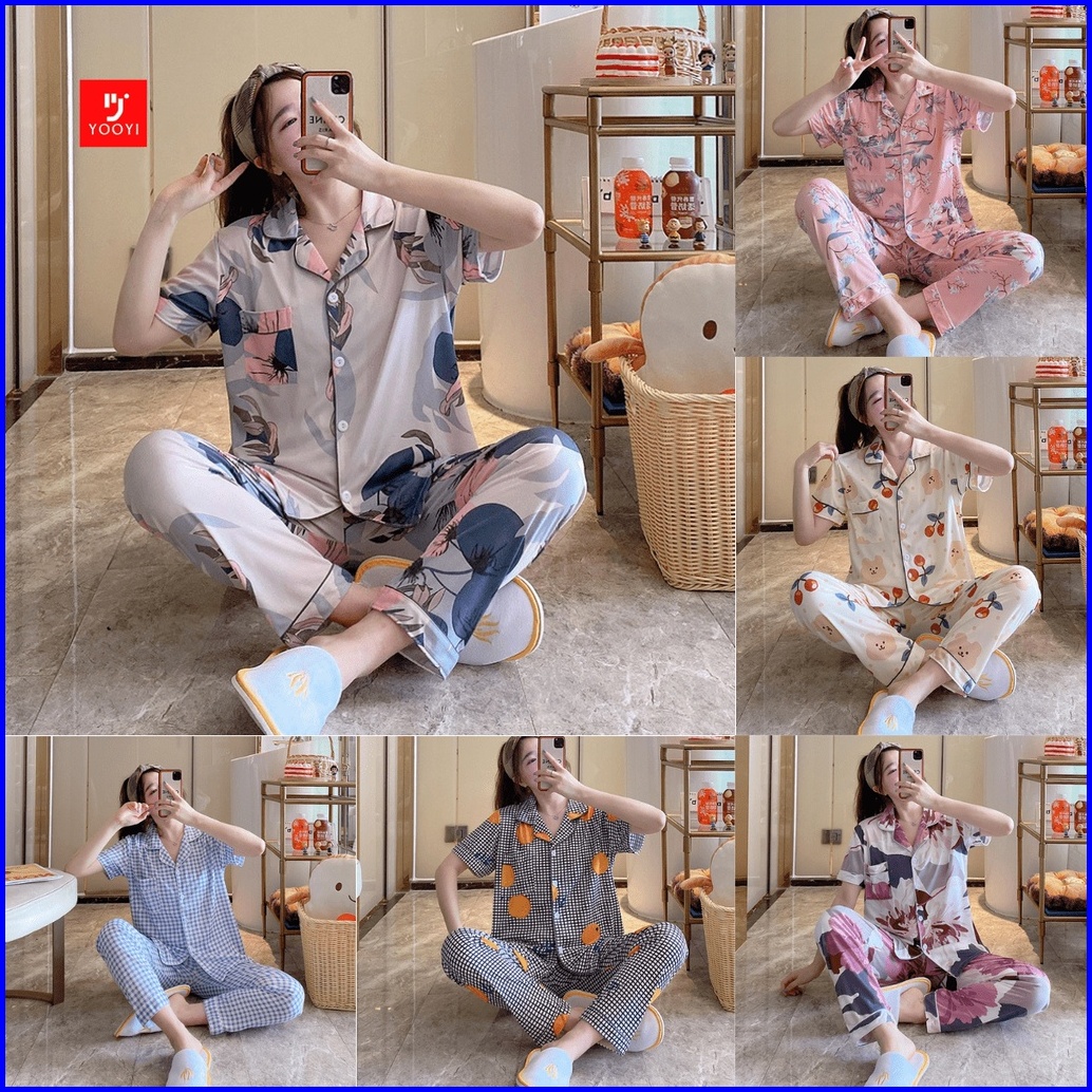 Yooyi Baju Tidur Wanita Piyama Cewek Set Kemeja Lengan Pendek Celana Panjang Style Korea Jumbo Dewasa Remaja Premium Ban