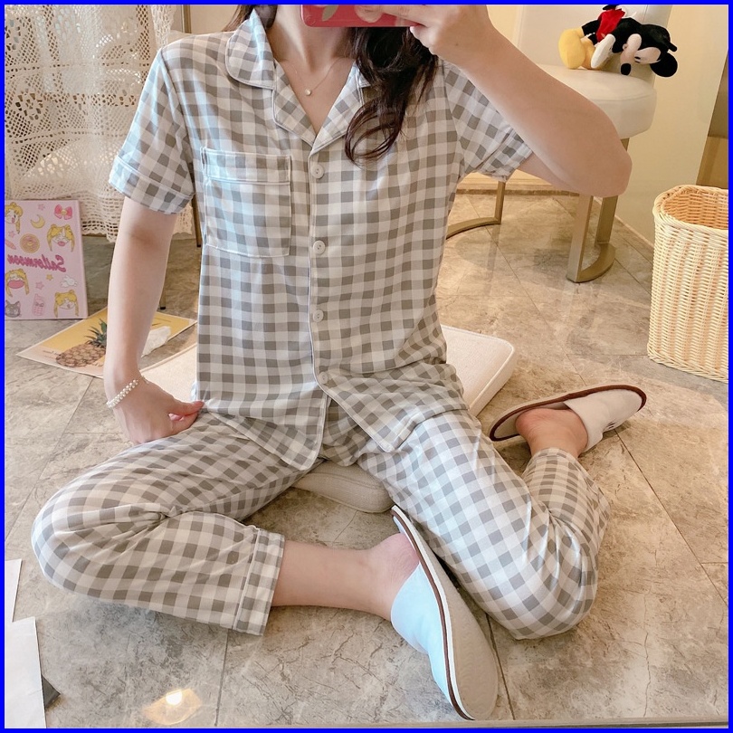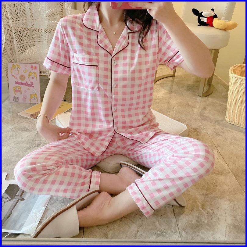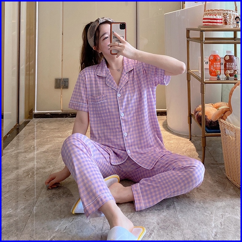 Yooyi Baju Tidur Wanita Piyama Cewek Set Kemeja Lengan Pendek Celana Panjang Style Korea Jumbo Dewasa Remaja98776tr Prem
