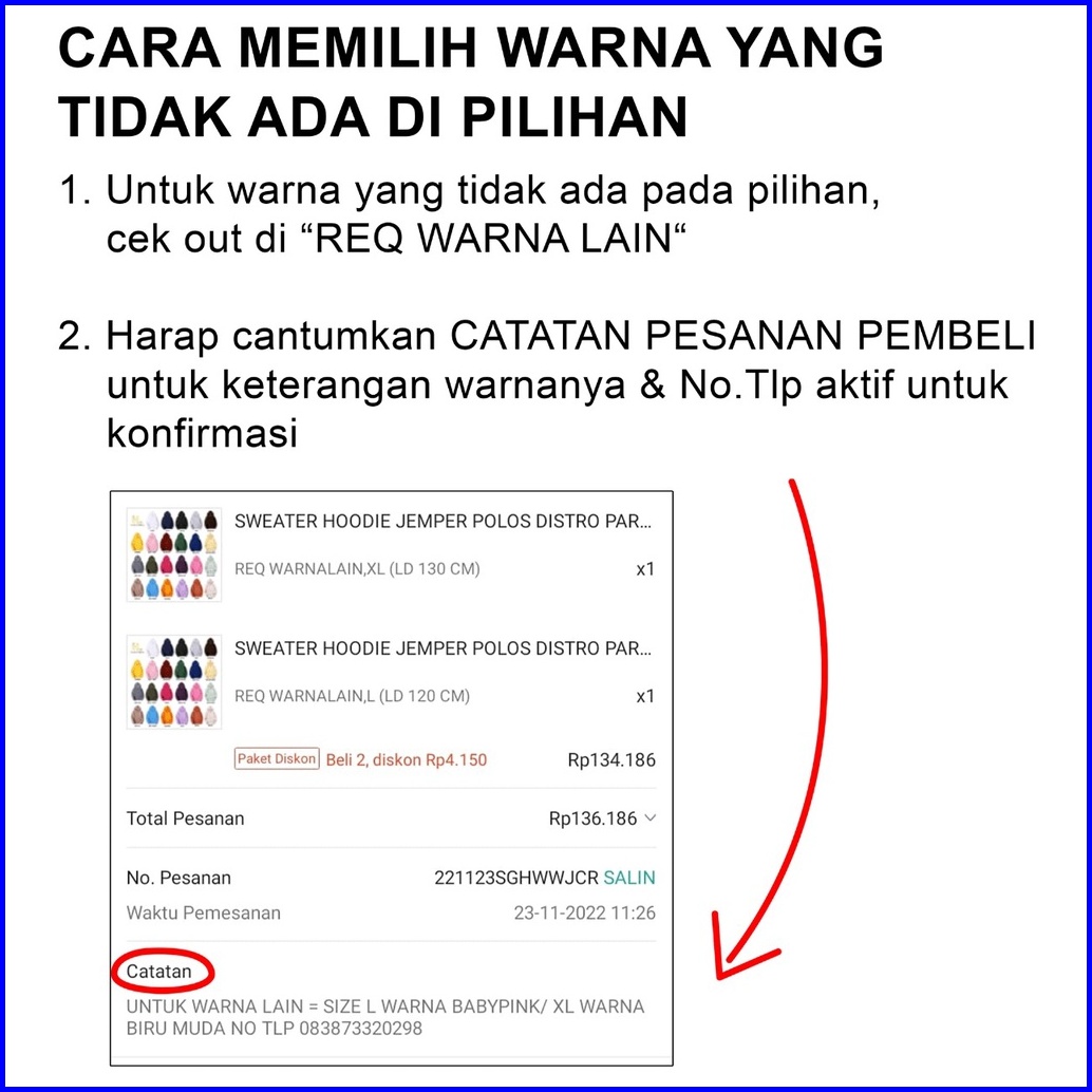 HITAM, PUTIH, NAVY, ABU MUDA, ABU TUA, HIJAU BOTOL, MAROON, MOCCA, BABY PINK, KUNING, HIJAU ARMY, COKELAT TUA, LILAC, BIRU MUDA, BIRU BCA, REQUEST WARNA LAIN