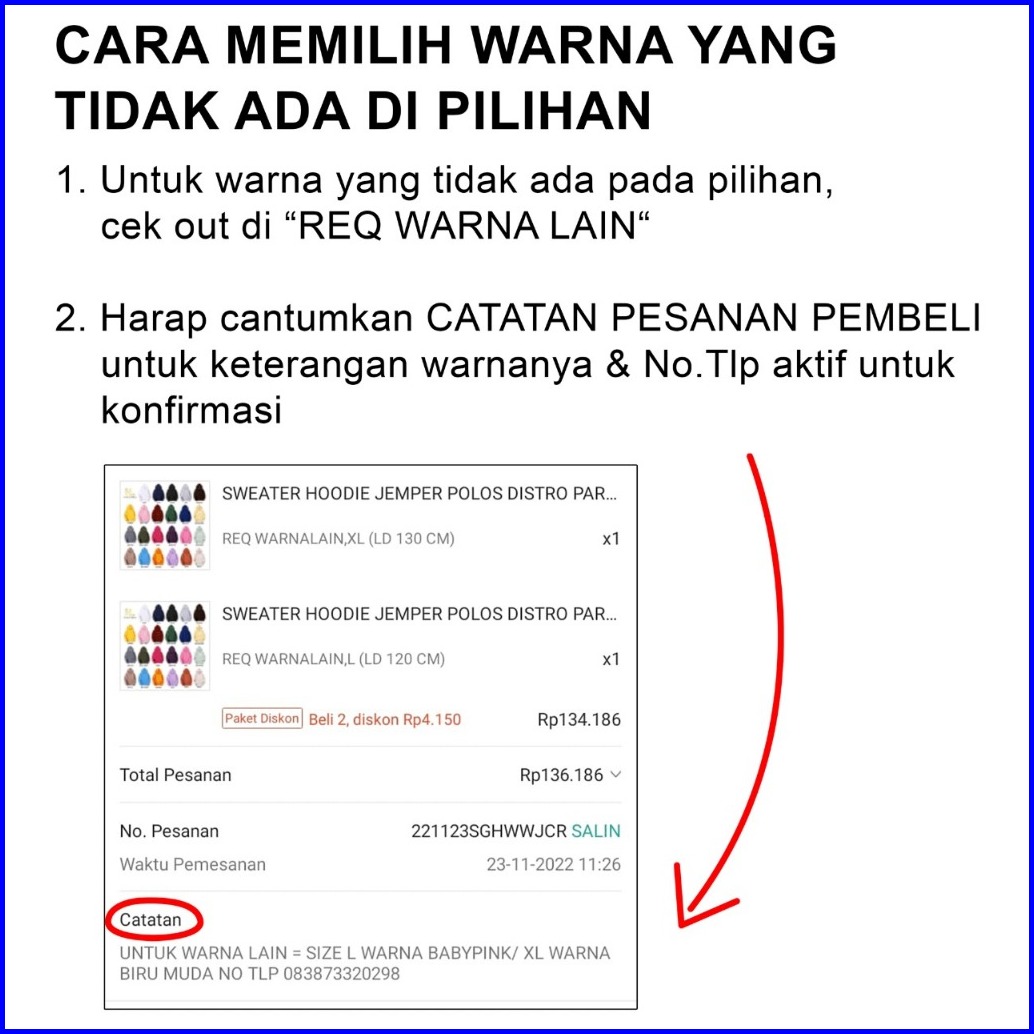 HITAM, BEIGE, UNGU TUA, PUTIH, BIRU BCA, BIRU MUDA, HIJAU ARMY, ABU MUDA, ABU TUA, REQ WARNA LAIN
