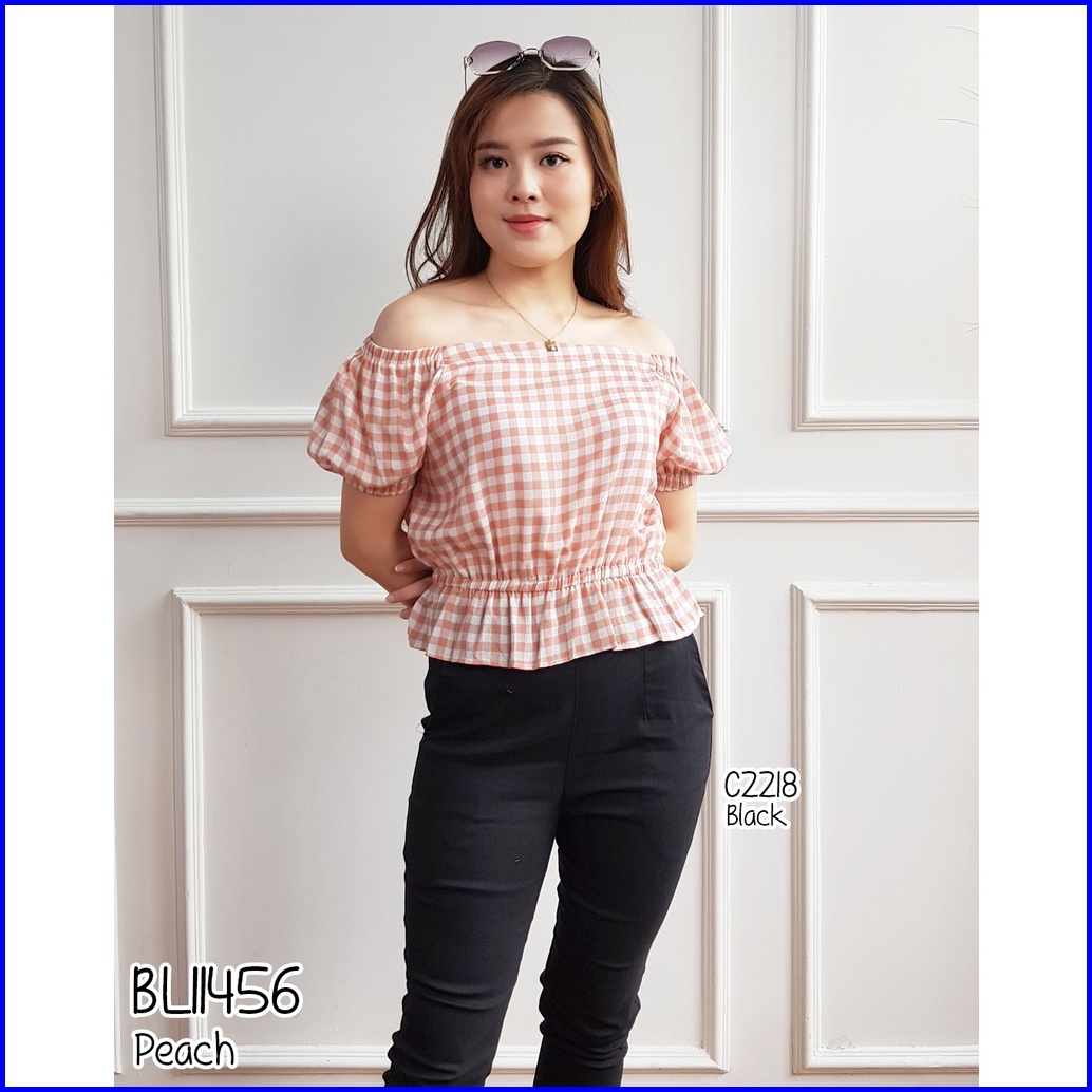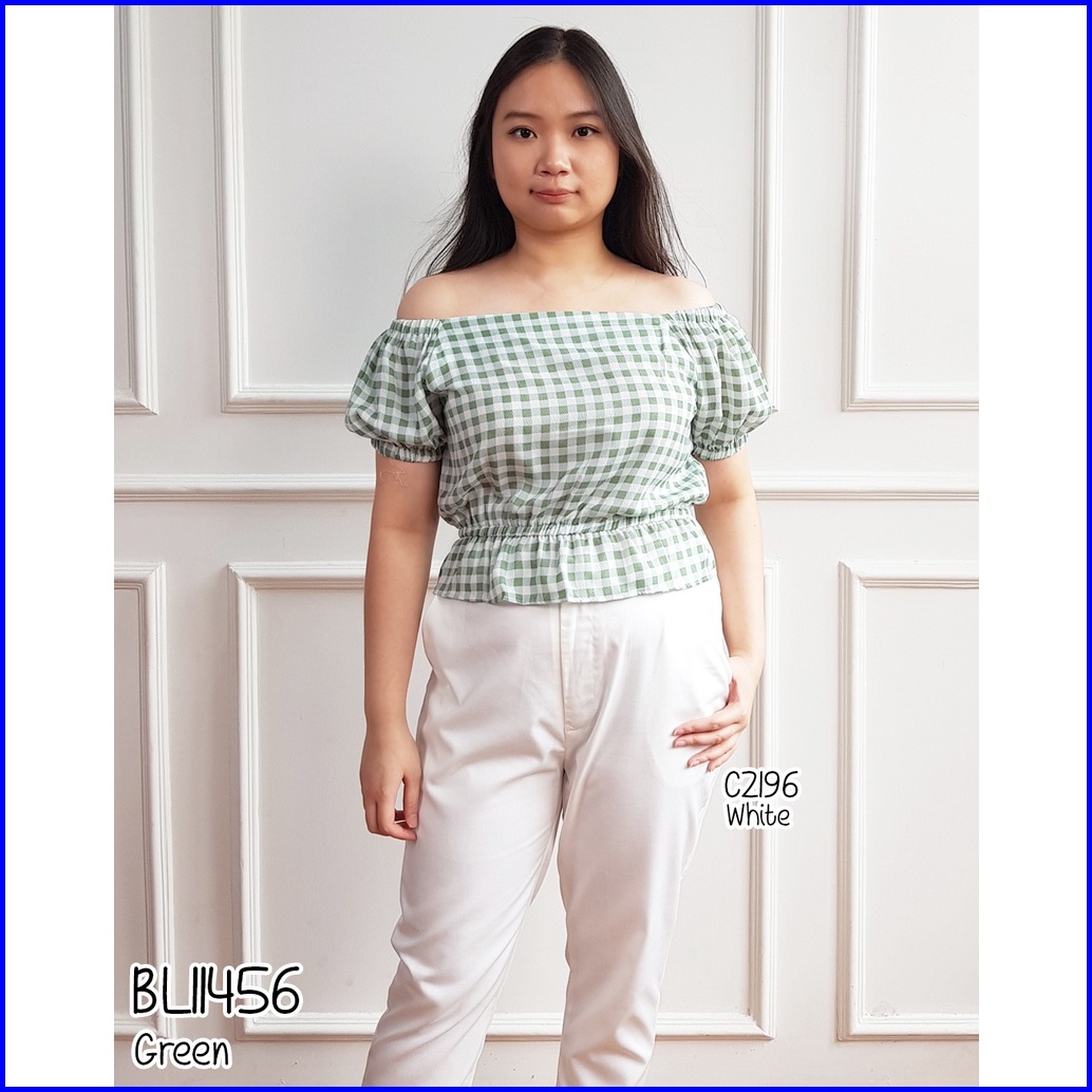 Missol Atasan Wanita Sabrina Motif Tartan Lengan Pendek 11456 Bl11456