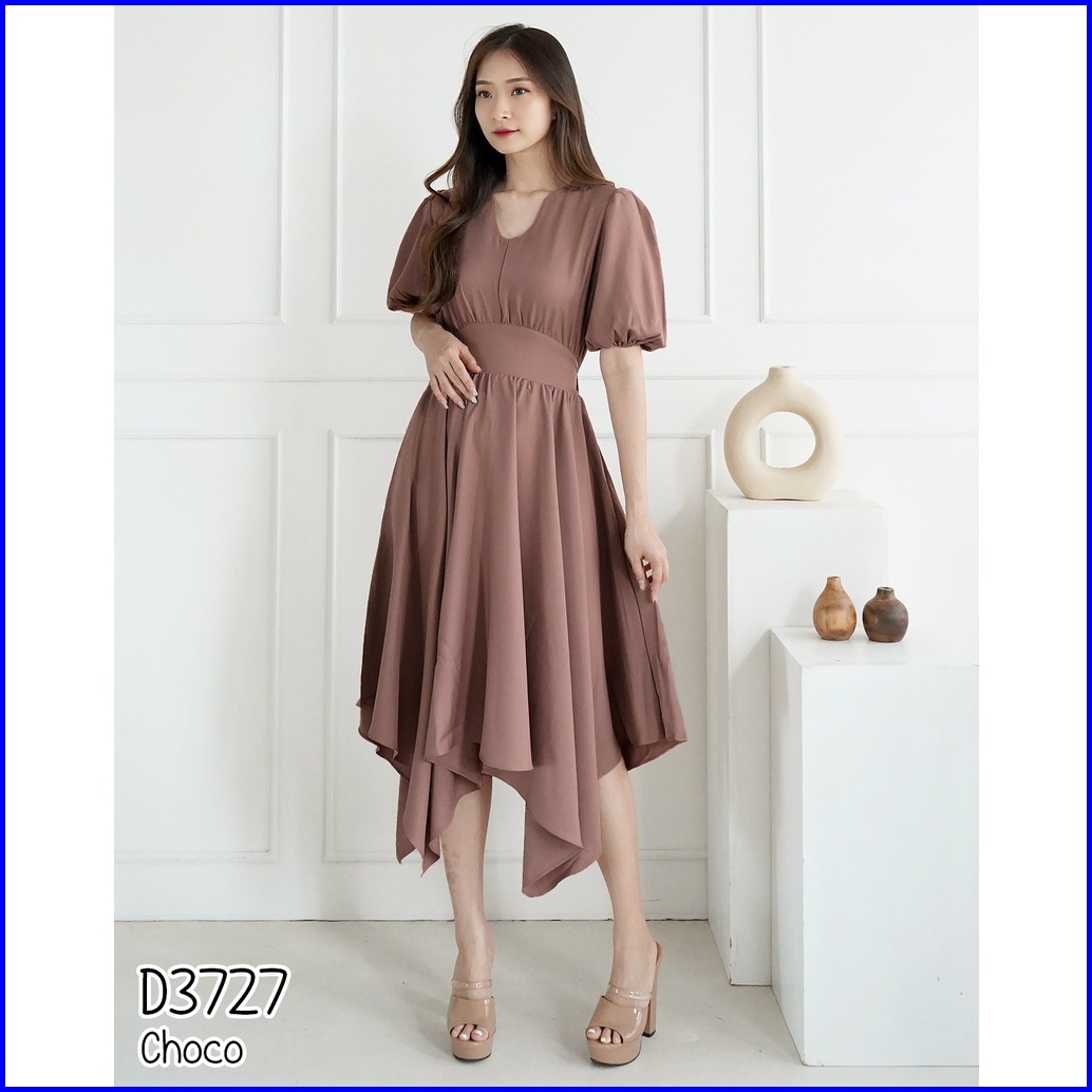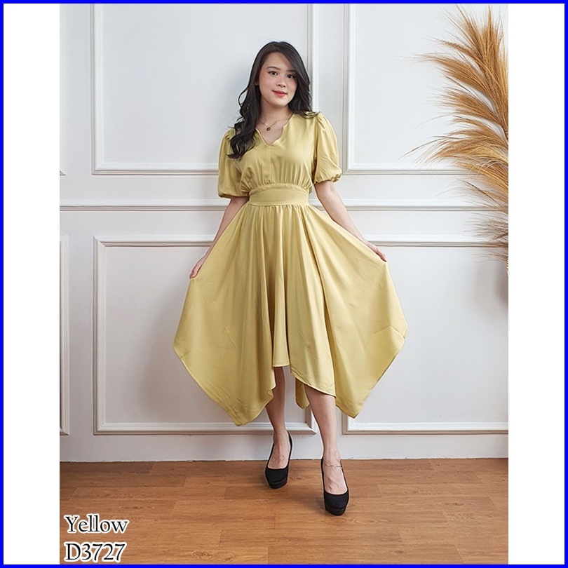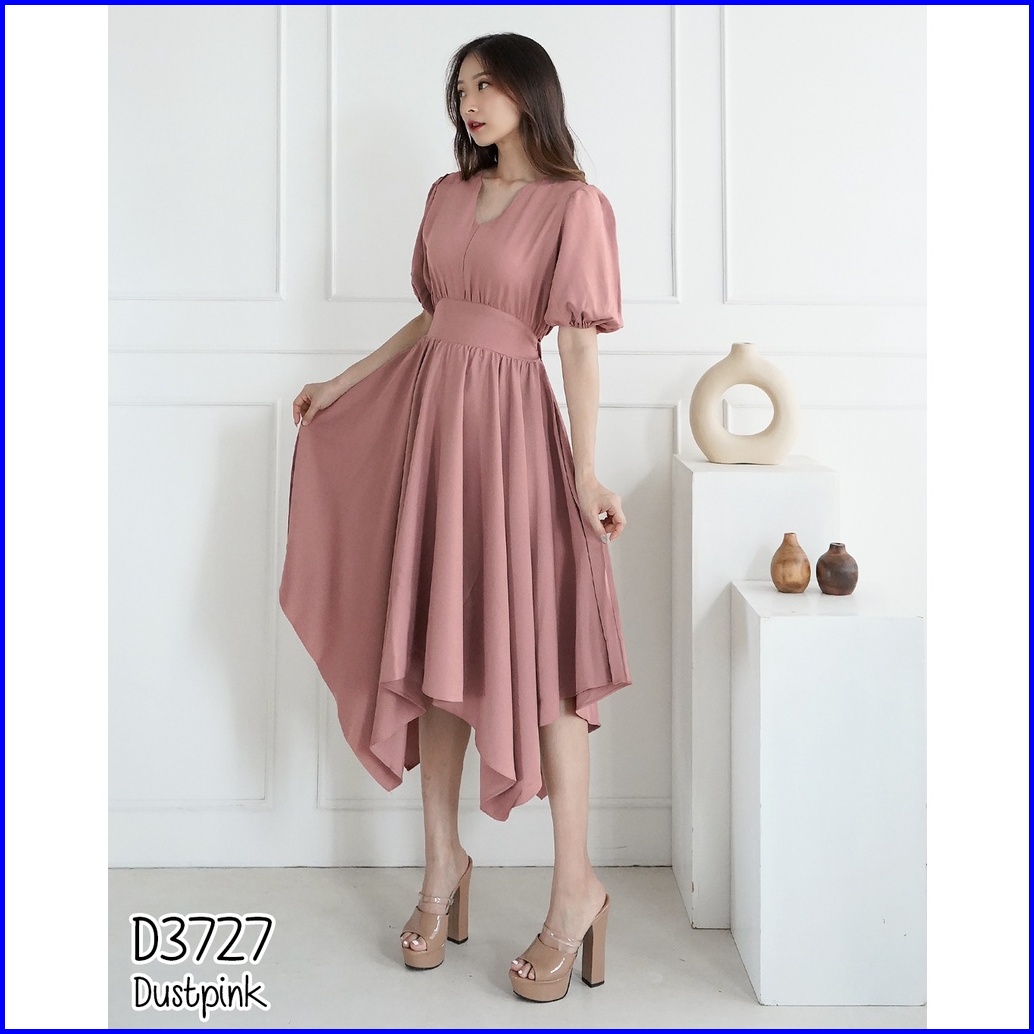 D3727 Dress Midi Asimetris Dress Polos Leher V Feminine Look Dress Pesta 3727