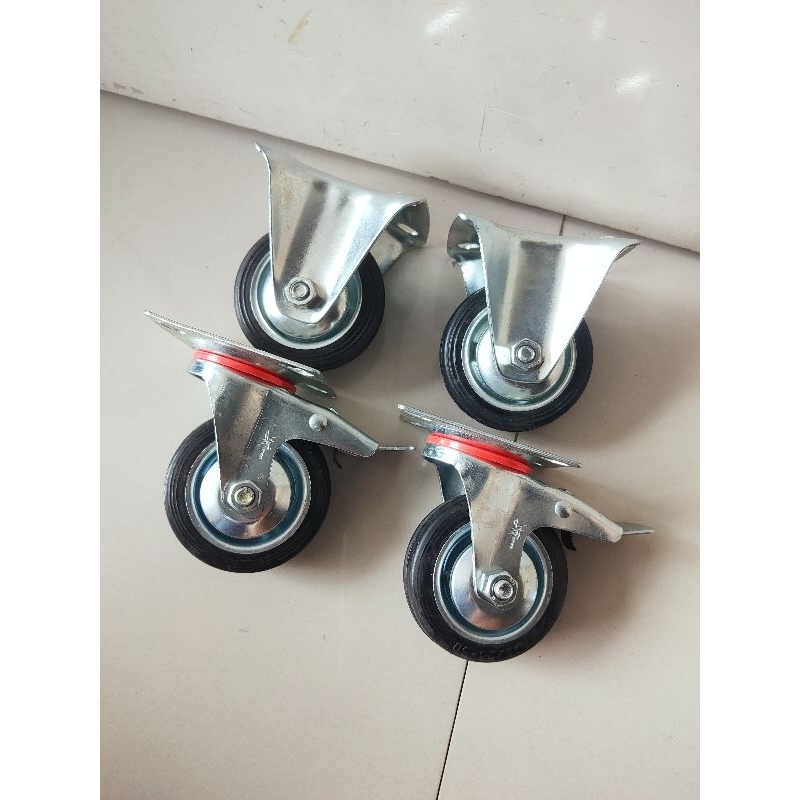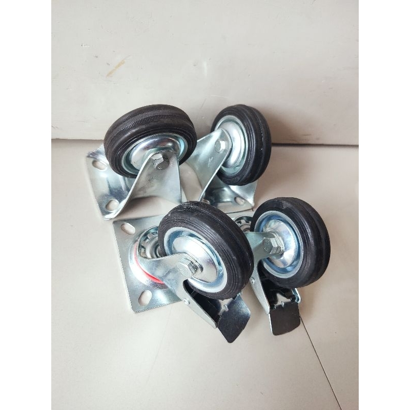 Paket roda gerobak 3" karet hitam 2 Rem 2 Mati Roda troli set 4pcs 3in trolley wheel Roda grobak