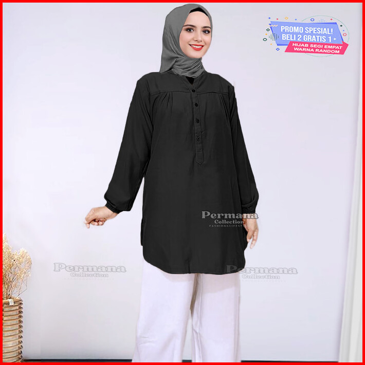 Baju Atasan Blouse Wanita Kemeja Lengan Panjang Hitam Jumbo Dewasa