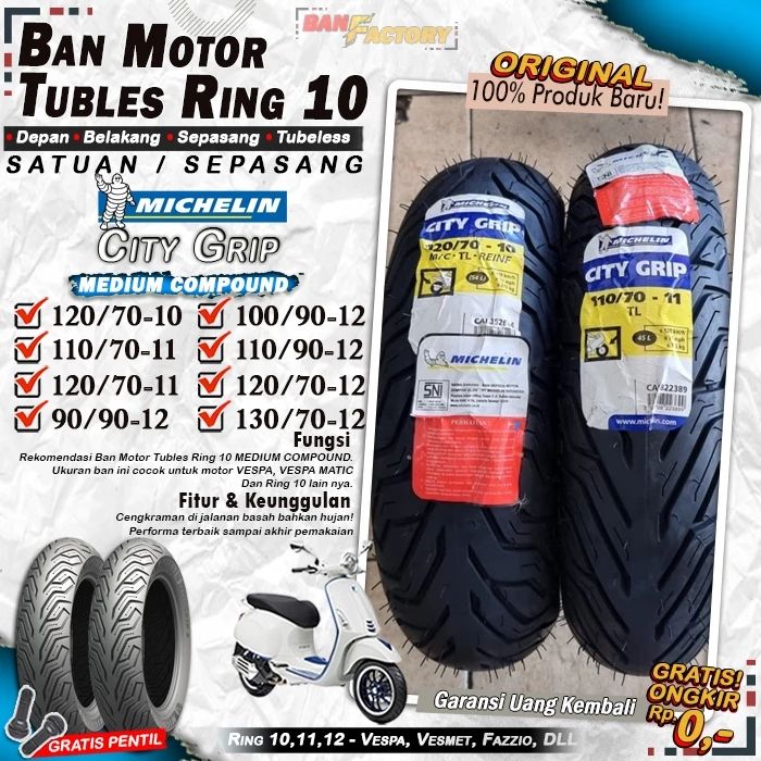 BAN MOTOR MATIC TUBLES MICHELIN CITY GRIP RING 10 BAN DEPAN BELAKANG VESPA MATIC RING 11 SCOOPY RING 12 TUBLES