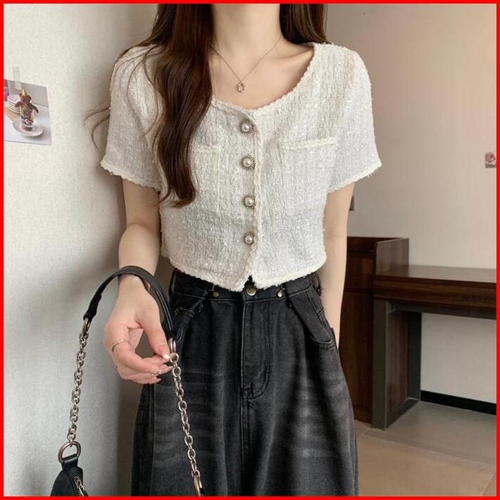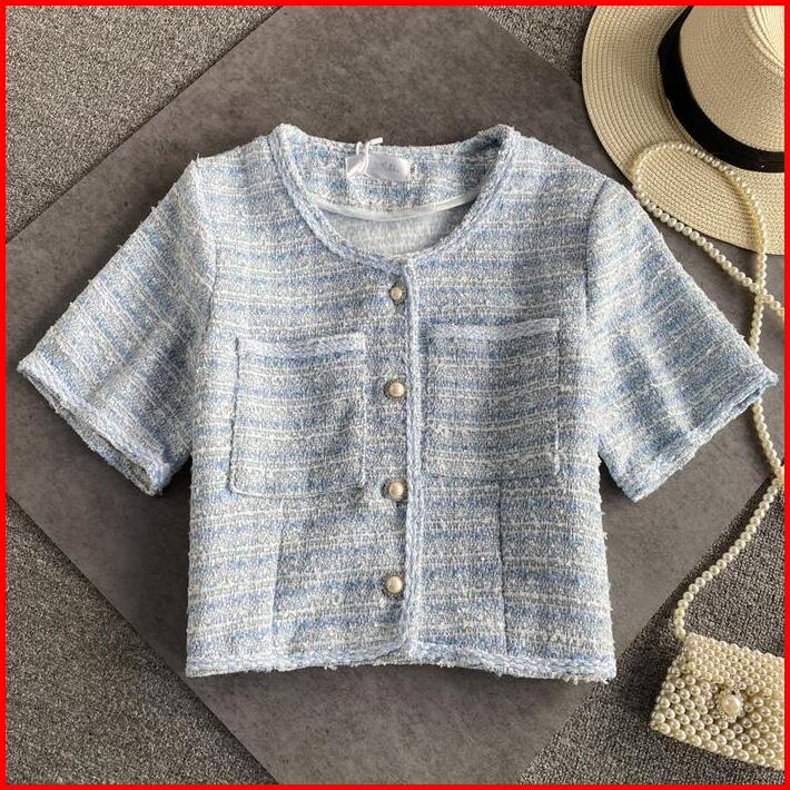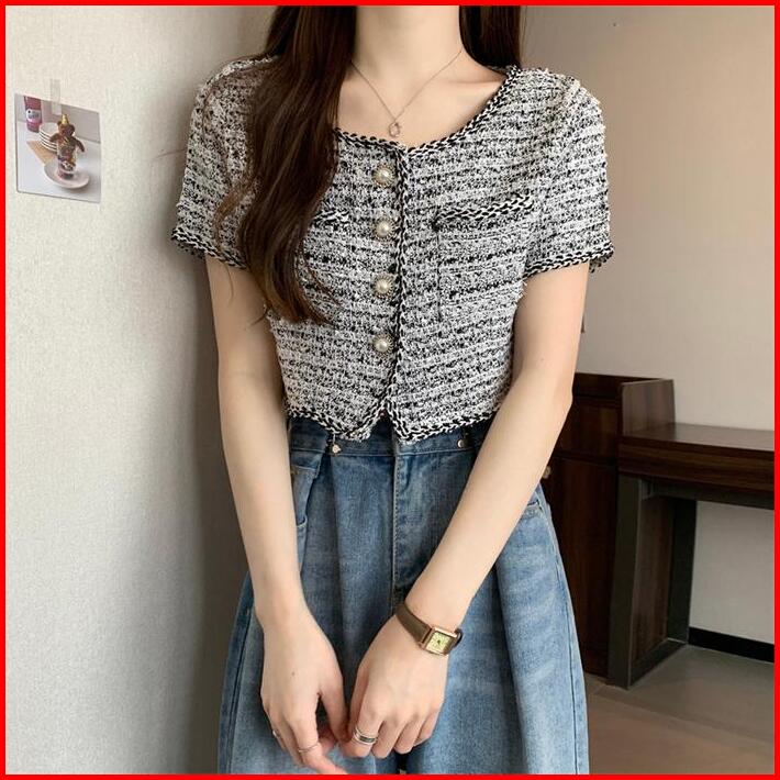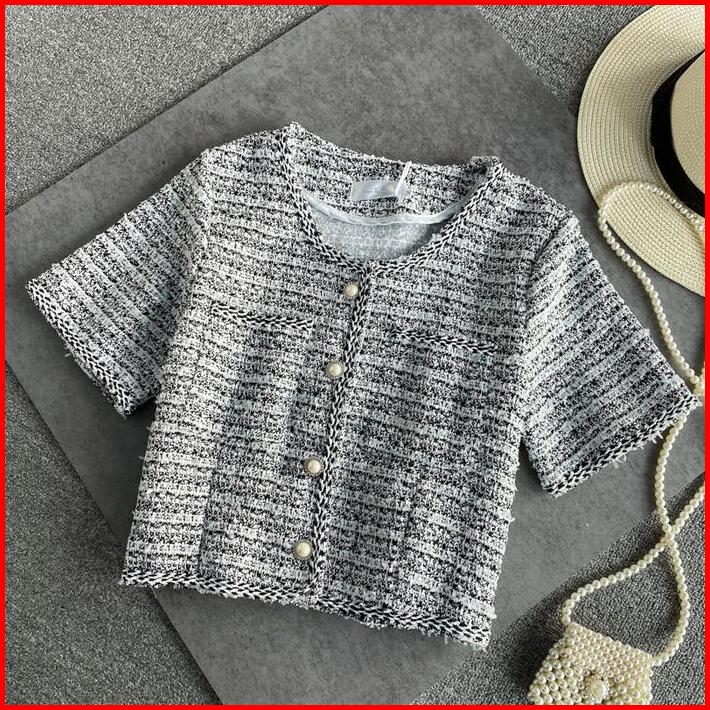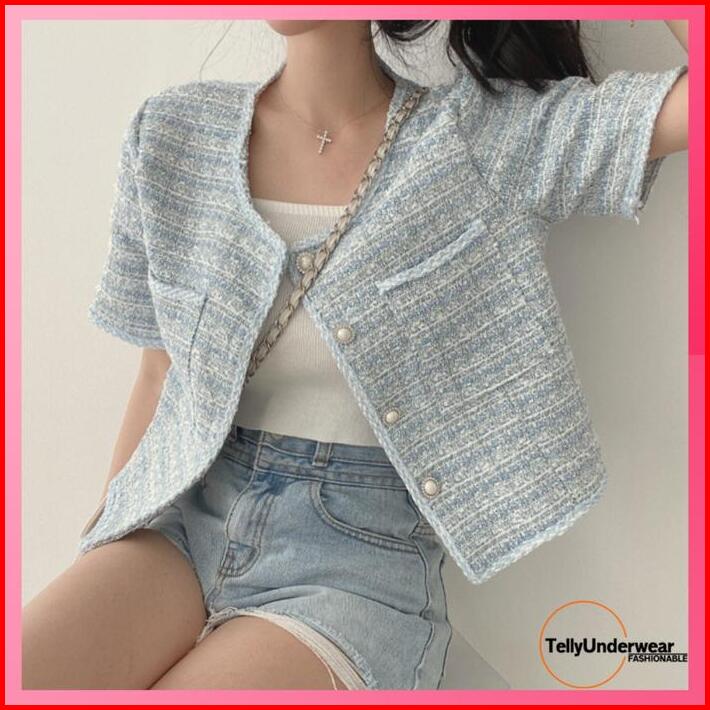 Telly 102 Kardigan Crop Vintage Tweed Style Lengan Pendek Premium Outer Kekinian Baju Atasan Wanita Lembut Nyaman