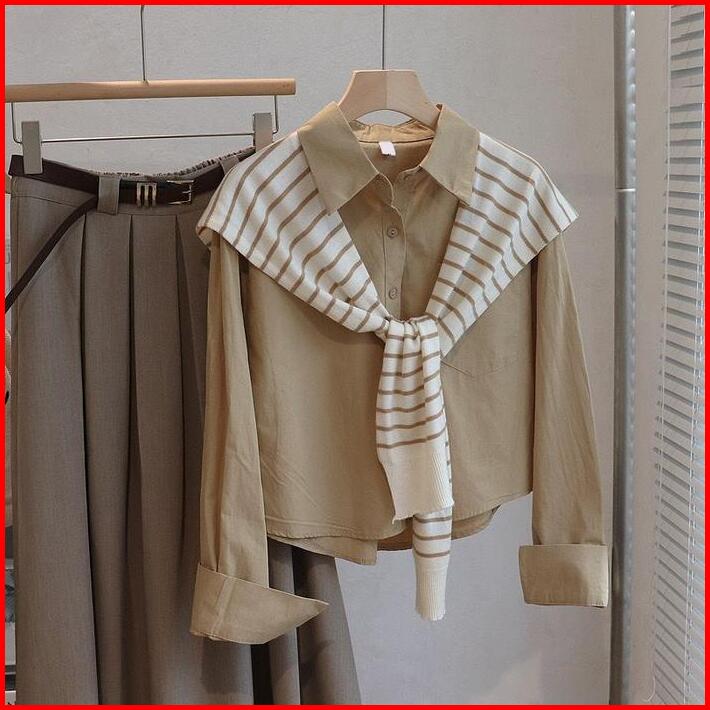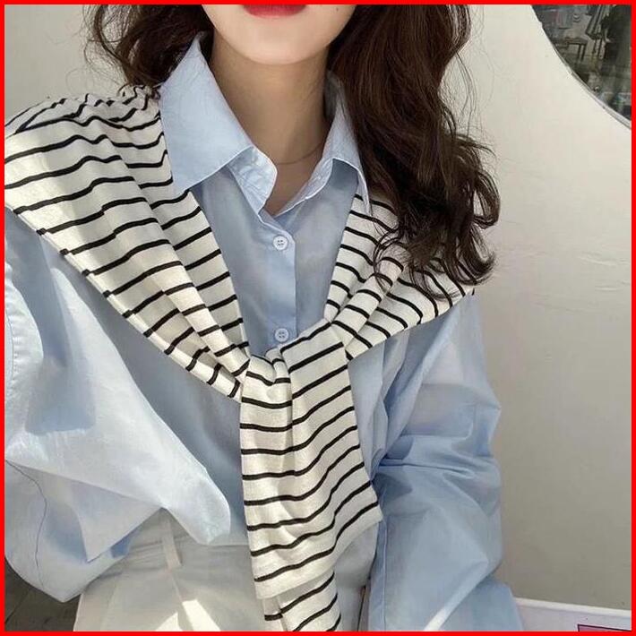 Jlookco Kemeja Lengan Panjang Wanita Korean Style Atasan Baju Motif Salur