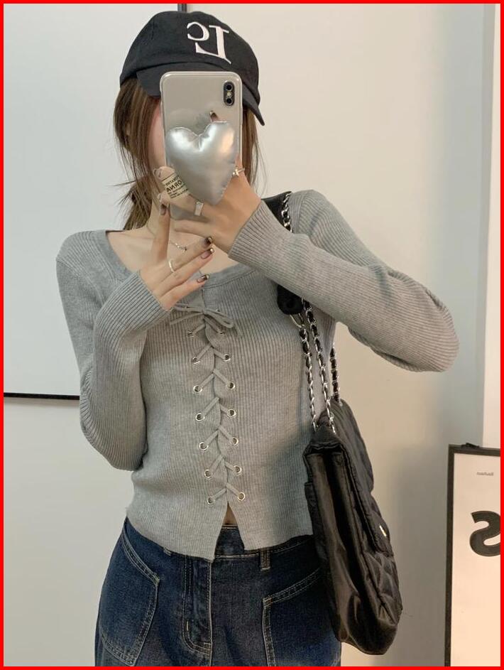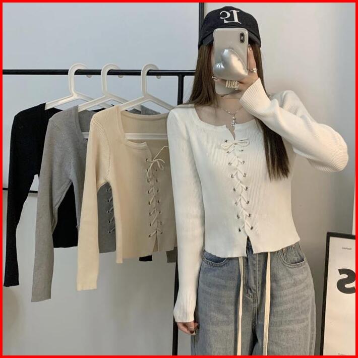 Premium Berynette 0323 Square Neck Slim Fit Cropped Stretcht Nyaman Knitwear Wanita Cardigan Top Atasan Panjang Basic At