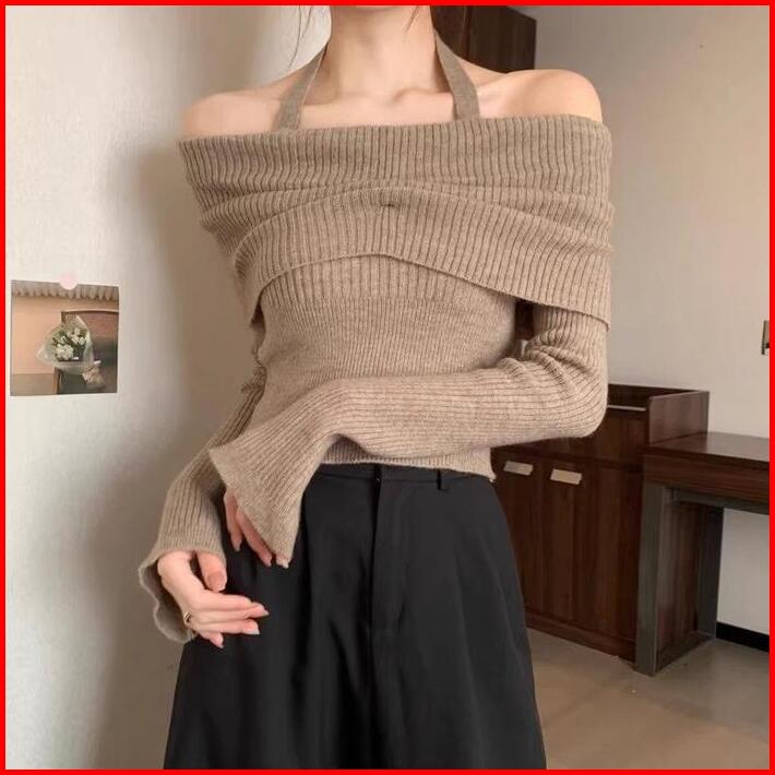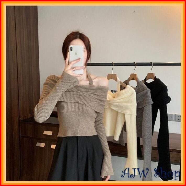 Ajw Xeg Atasan Wanita Sabrina Cutt Off Tali Leher Knit Premium Baju Wanita Rib Sabrina Cutt Off Tali Leher Rajut Premium