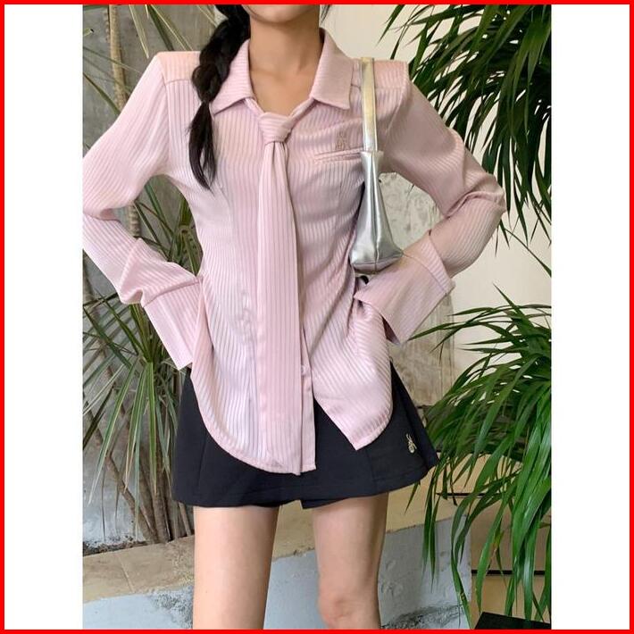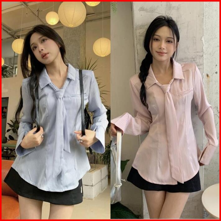 Kemeja Pita Gaya Korea Untuk Wanita Atasan Lengan Panjang Biru Yang Menempel Di Pinggang Gaya Preppy Dengan Bantalan Bah