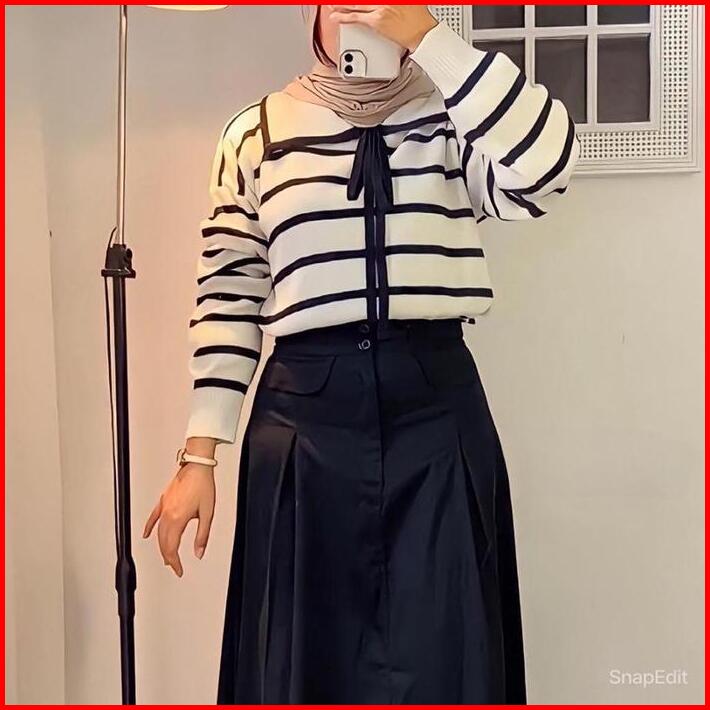 Eily Atasan Wanita Rajut Korea Motif Garis Kerah Lengan Panjang Baju Knitwear