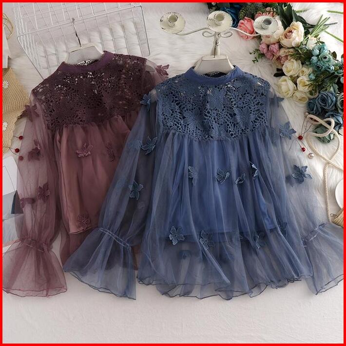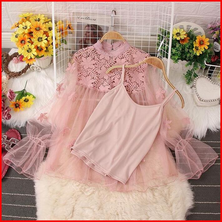 2 Pcs Mesh Top Suspender Cutout Collar Flared Sleeves Lace Blus Atasan Wanita Oversize Outer Panjang Light Casual Baju C