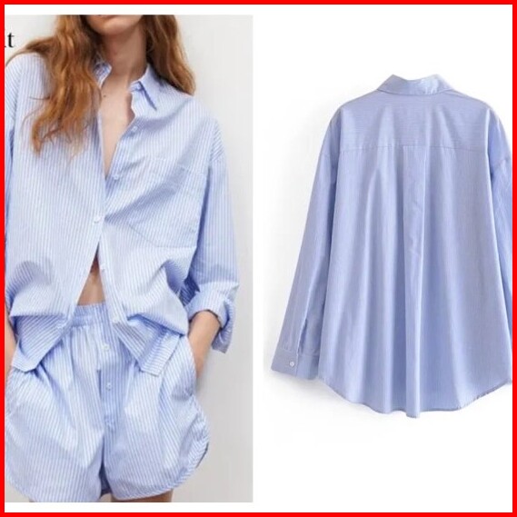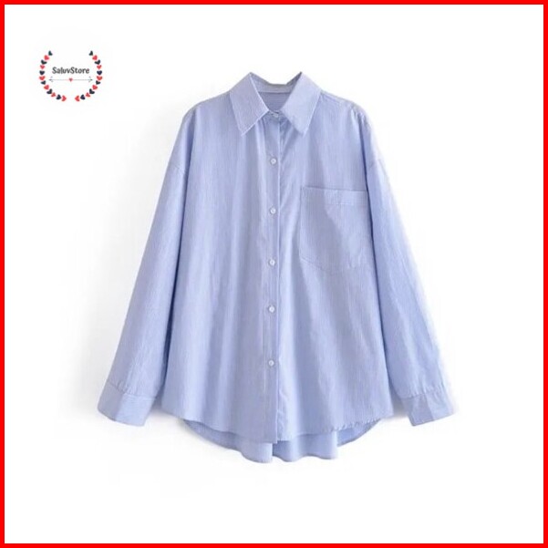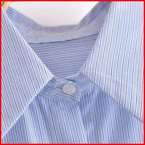 Baju Atasan Wanita Kemeja Lengan Panjang Oversize Biru Muda Garis