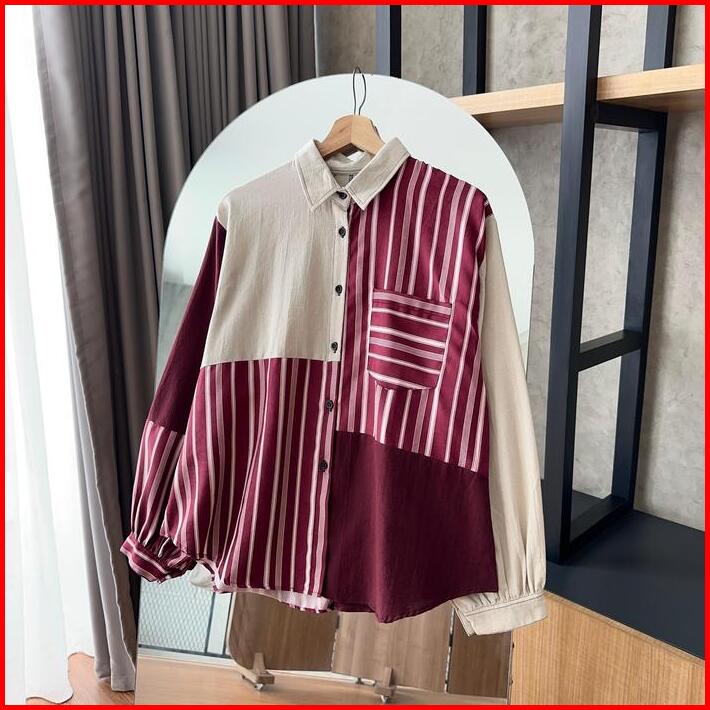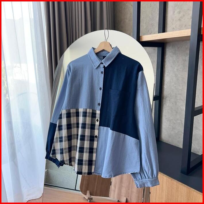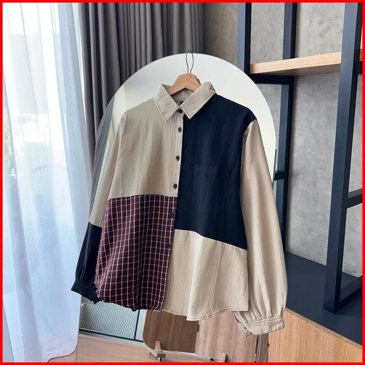 By.hana 687 Kemeja Oversize Linen Motif Kombinasi Atasan Wanita Variasi Baju Katun Panjang