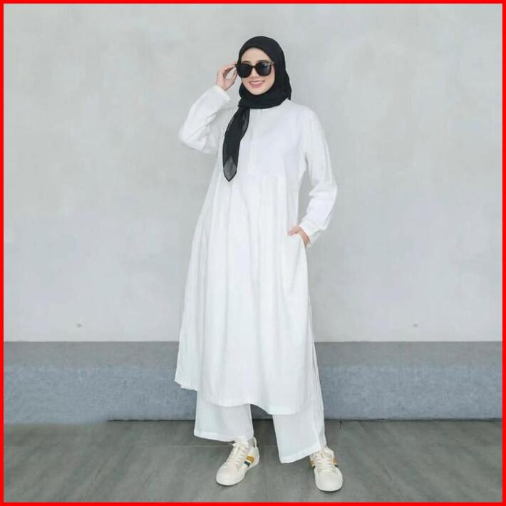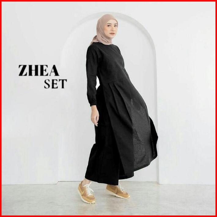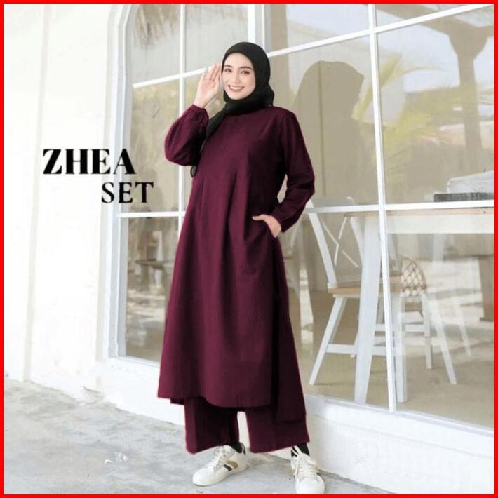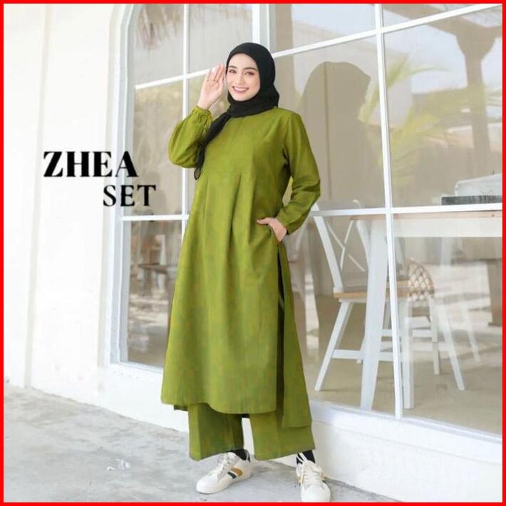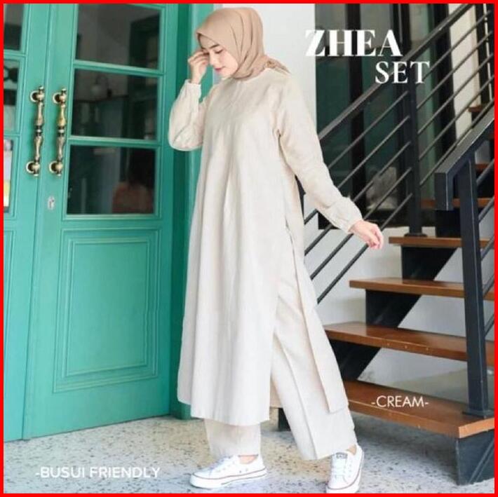 Zhea Set Setelan Kekinian Cewek Oneset Tunik Celana Pakain Wanita Muslim Busui Polos Bahan Katun Linen Premium Atasan Ba