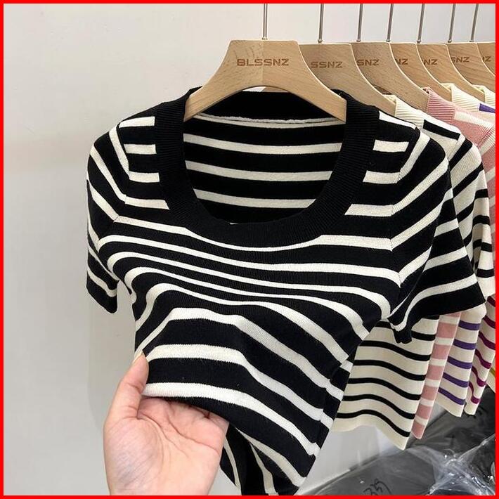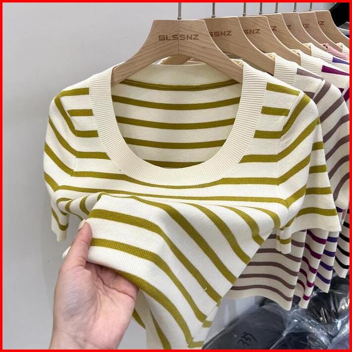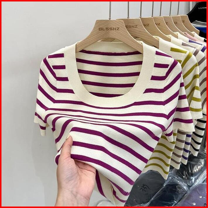 Atasan Knit Wanita Stripe Lengan Pendek Atasan Rajut Salur Wanita Baju Garis Knitwear Panjang Bulat