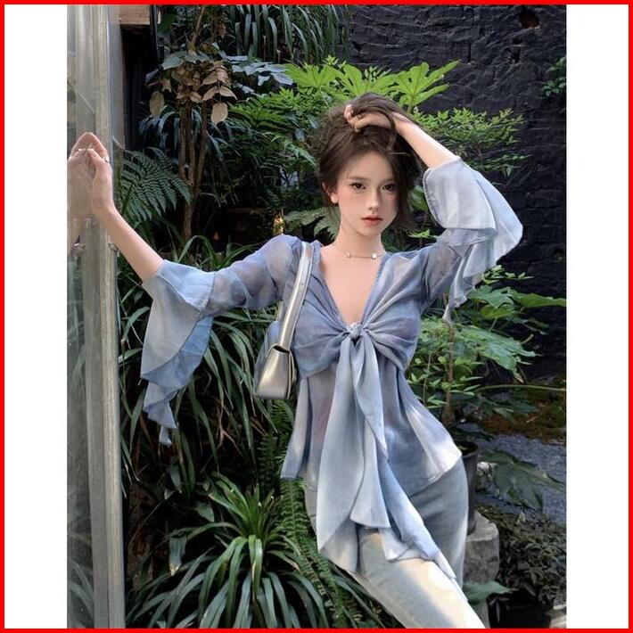 Heysoul Blue Ruffled Long-sleeved French V-neck High End Blouse T Shirt Atasan Baju Wanita Panjang Retro Casual Outer Tr
