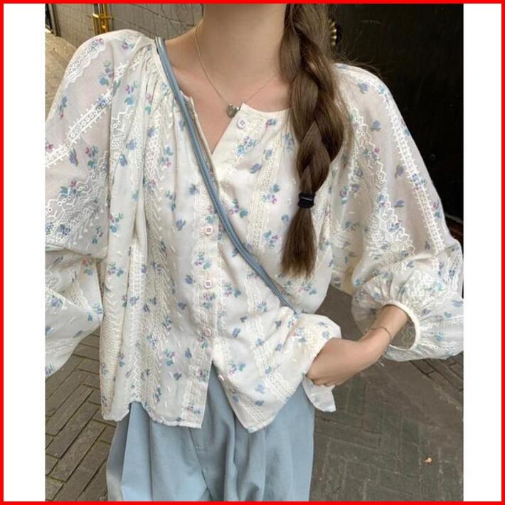 Nala Blouse Bunga Putih Korean Style Lengan Panjang Hijab Wanita Atasan Baju Top Motif Casual Crop