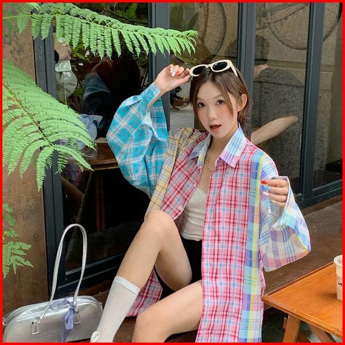 Kemeja Motif Kotak-kotak Sambungan Tipis Dopamin Gaya Korea Untuk Wanita 2024 Jaket Kemeja Pelindung Matahari Kasual Ser