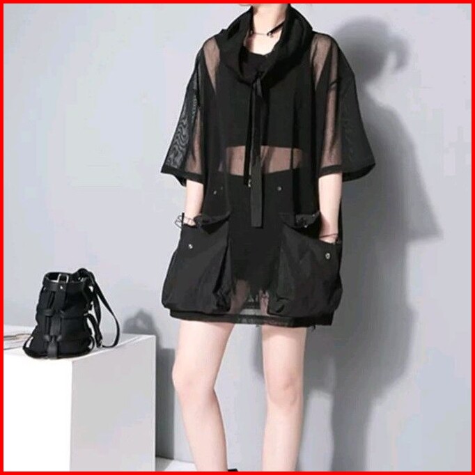Baju Jaring Korea Style Blouse Harajuku Leher Tinggi Blus Jaring Gamblok Atasan Wanita Kekinian