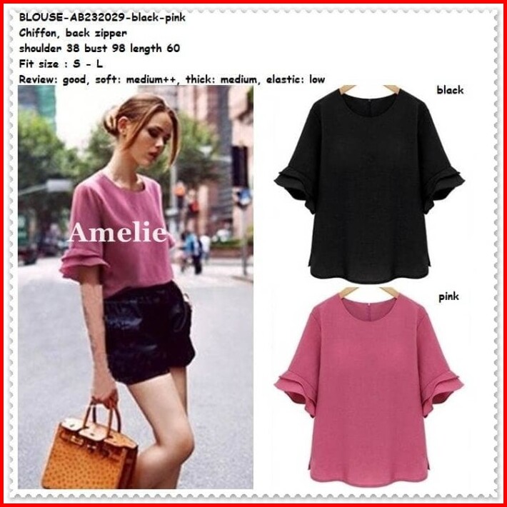 Baju Atasan Lengan Pendek Ruffle Blouse Wanita Korea Import Pink Black