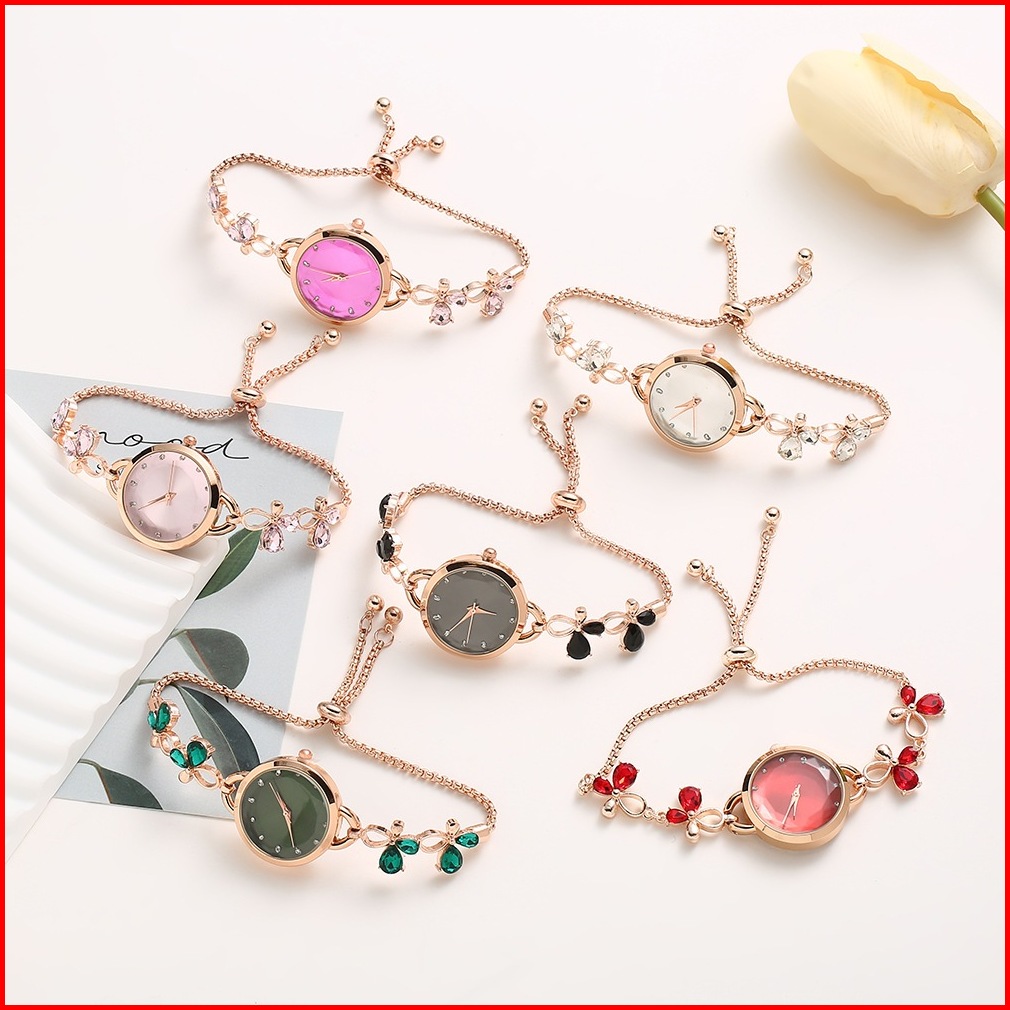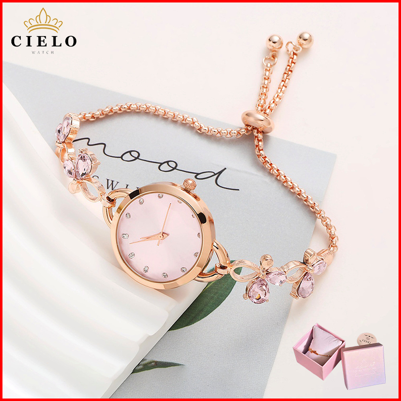 Cielo Jam Tangan Gelang Wanita Serut Tail Rantai Rose Pink Black Cewek Bunga Elegan Mewah Korea Berlian Busur Kosong Dia