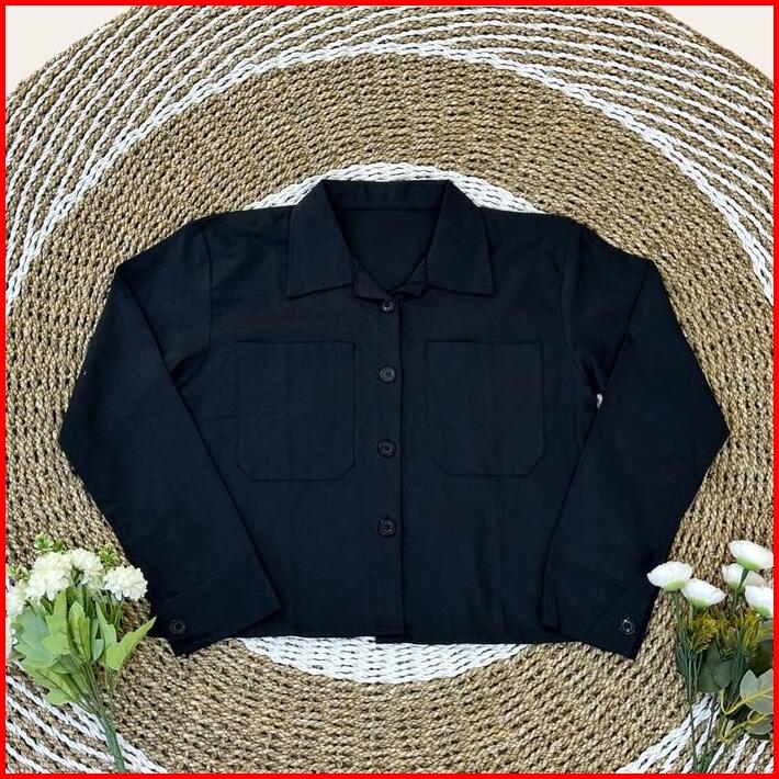 Kemeja Crop Top Linen Wanita Earth Tone Outfit Cewek Bumi Basic Shirt Polos Lengan Panjang Outfit Wanita Murah Army Atas