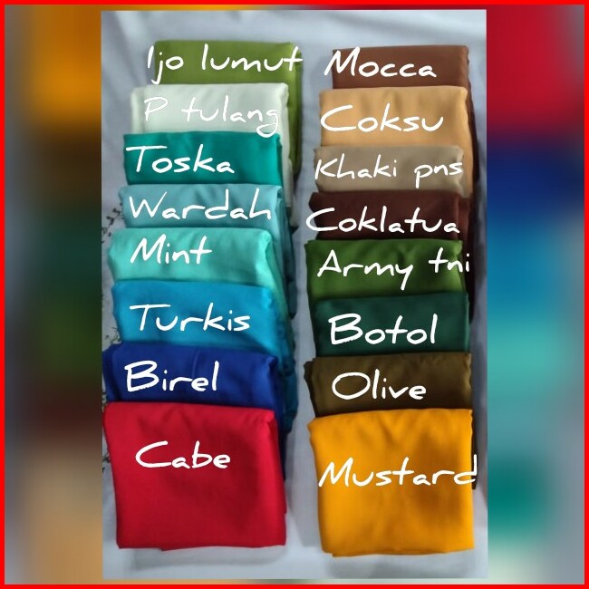 Hitam, NAVI, MILO/MOCA TUA, MERAH MARUN, DUSTY, DOVE, ARMY OLIVE, IJO BOTOL, BAIGE, WARDAH, MERAH BENDERA, NU / IJO LUMUT, MOCA MUDA, UNGU MUDA LILAC, ABU DENIM, WARNA DI CHAT, Lavender, Cokelat Tua, WARNA LAIN, KHAKI LATE, PUTIH BERSIH, SAGE GREEN, ABU SILVER, COKSU, PUTIH TULANG BW, limon, DENIM NIAGARA, khaki pns