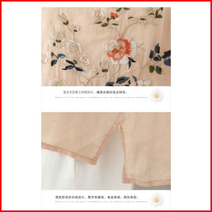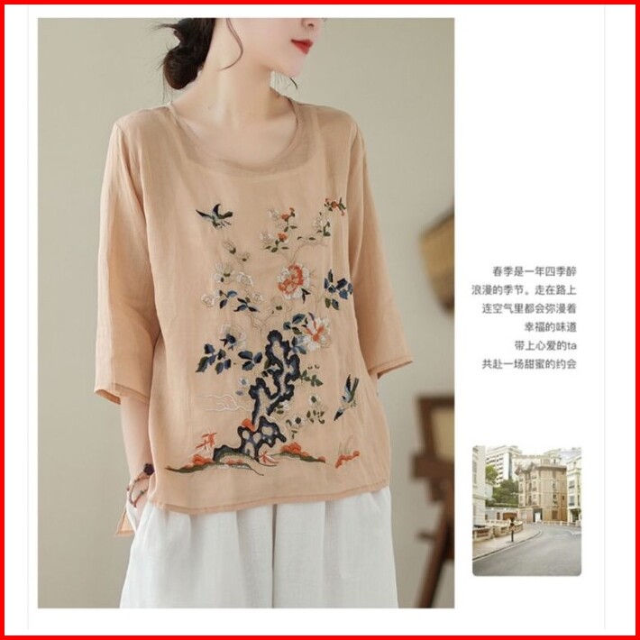 Baju Wanita Atasan Blouse Motif Bordiran Bahan Katun Linen Import Cina