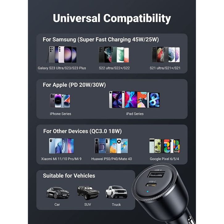 UGREEN Car Charger Mobil 63W - Dual Port USB C 45W PD QC Fast Charging - 90645