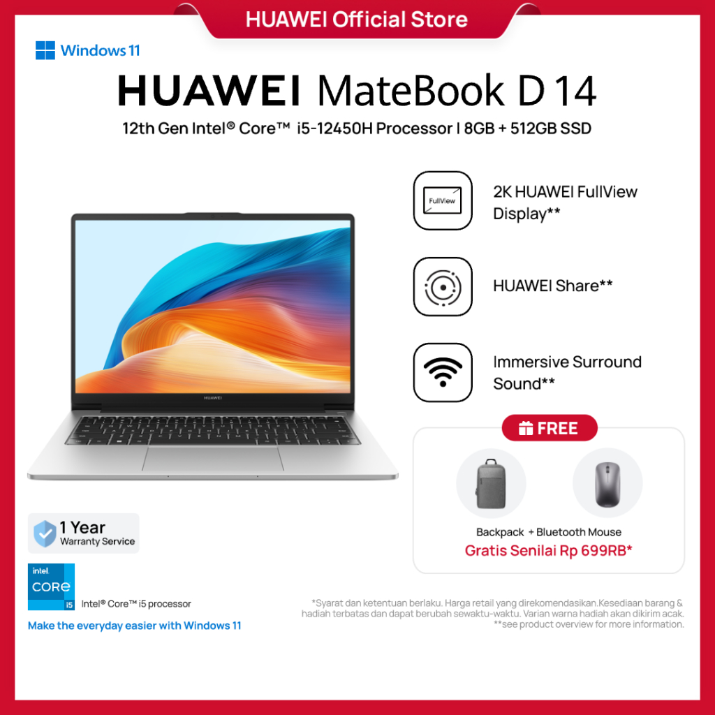 [TOP PICK] HUAWEI MateBook D 14 up to i5-13420H | up to 16+512GB SSD | Sleek Full Metal Body | Win11 Laptop | Eye Comfor