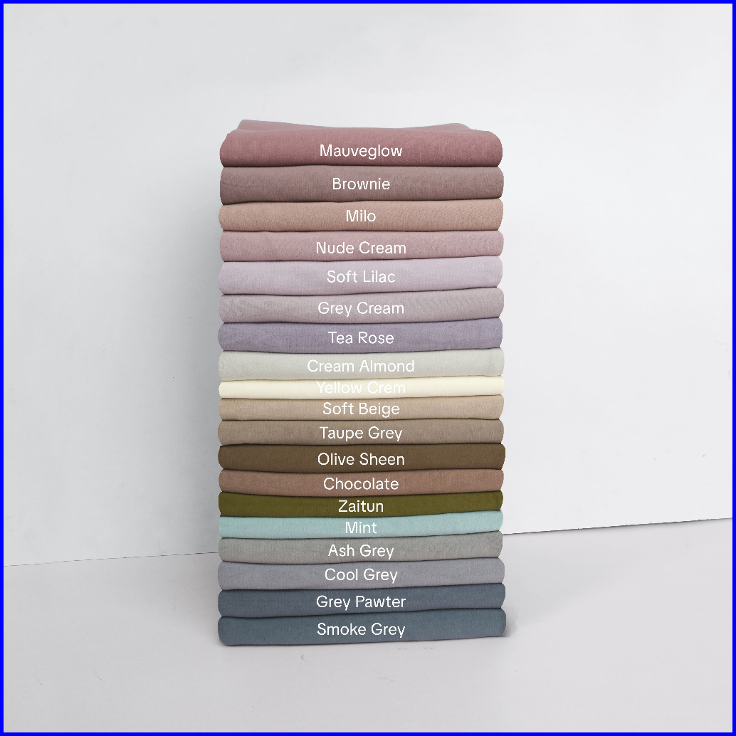 Khaki, Black, Grey, Taupe, Navy, Broken White, Stone Grey, Nude Cream, Hazelnut, Army, Brown Sugar, Dark Grey, Mulberry, Peanut, Coffee, Beige, Brick, Green, Brownie, Chocolate, Cream Almond, Cool Grey, Grey Cream, Olive Sheen, Soft Beige, Soft Lilac, Taupe Grey, Tea Rose, Grey Pewter, Ash Grey, Smoke Grey, Zaitun, Mauve Glow, Milo, Mint, Nude Pink, Yellow Cream, Pink Blush, Sand, Natural, Burgundy, Brown Muffin, Wood, Plum