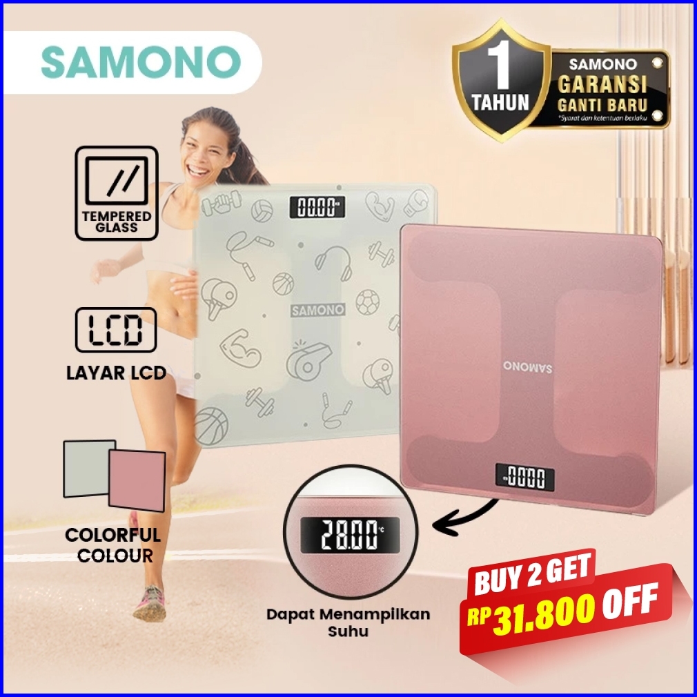 Samono Timbangan Badan Digital Kaca Body Scale Up To 150kg Presisi 0.05kg Layar Led 26cm X 26cm Penampil Suhu Otomatis G