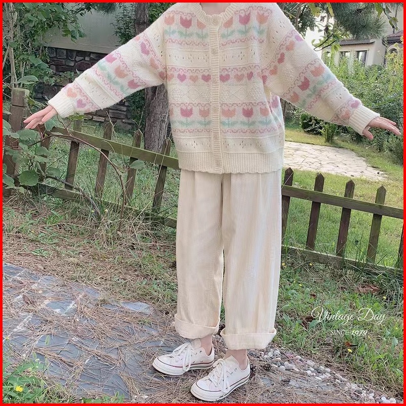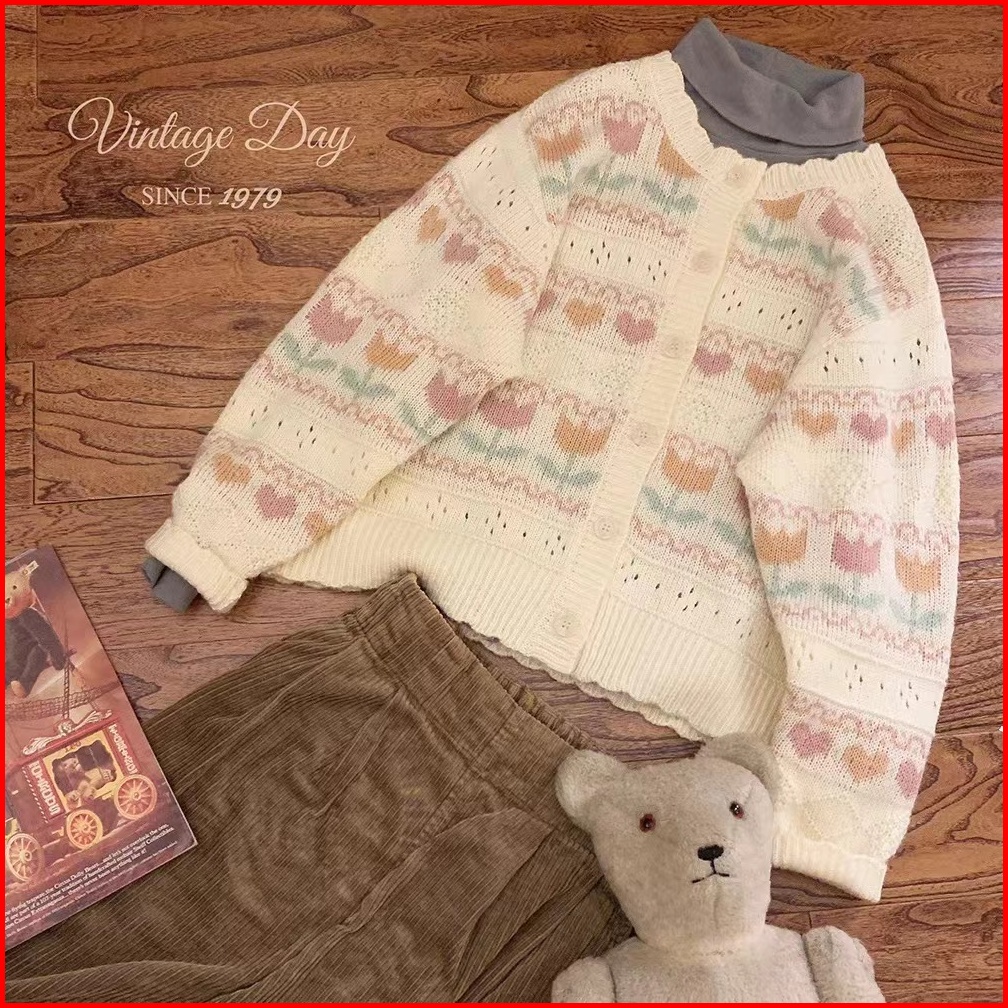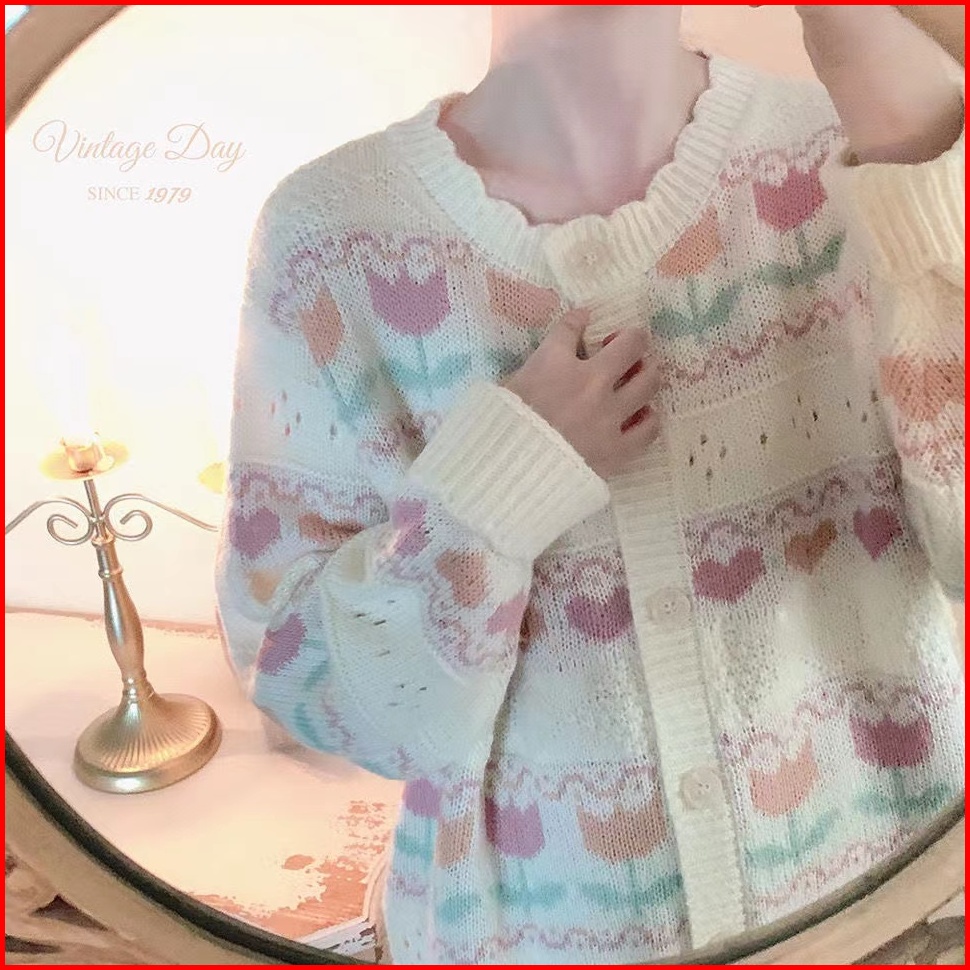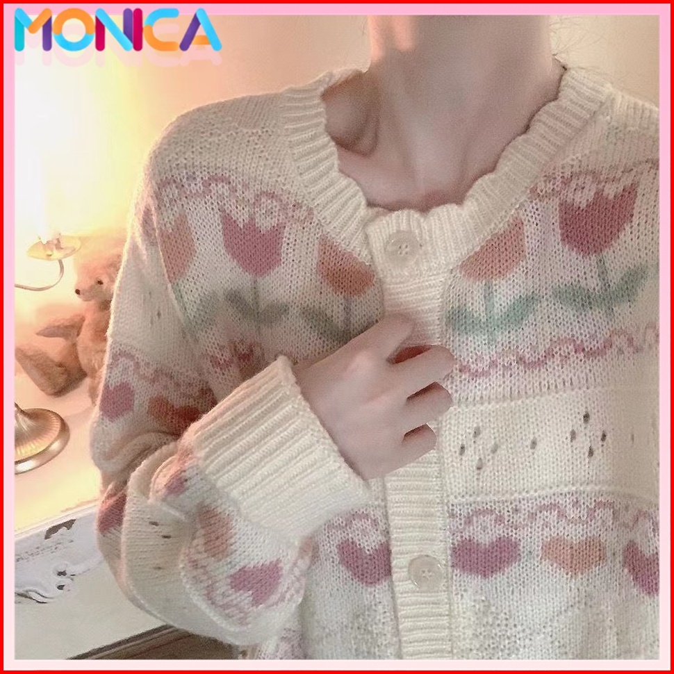 Monica Tulip Sweater Jepang Wanita Longgar Angin Malas Retro Desain Lembut Niche Cardigan Jacket