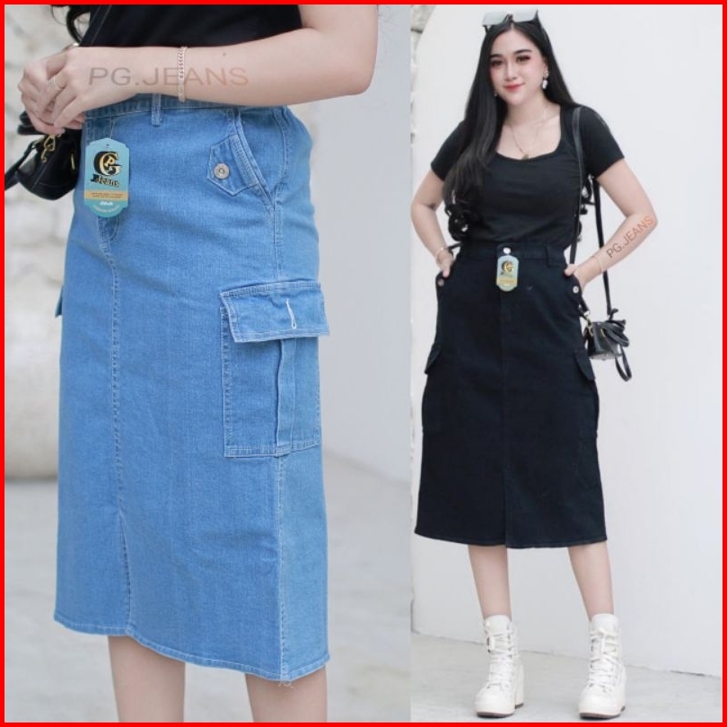 Gpjeans Trend Rok Jeans Kargo Wanita Midi Highwayst Karet Belakang